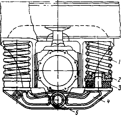Рессорное подвешивание тепловозов ТУ6А и ТУ7 индивидуальное (на каждое колесо) и состоит из двух спиральных пружин /. Для более равномерного распределения нагрузки между пружинами они соединены снизу балансиром 4, который через ось 5 передает нагрузку от обрессоренных частей тепловоза буксе. В отверстие балансира под ось запрессована закаленная стальная втулка. Между опорой балансира и нижней опорой 2 пружины установлено резиновое кольцо 3, гасящее высокочастотные колебания, передаваемые от необрессоренных частей тепловоза.
