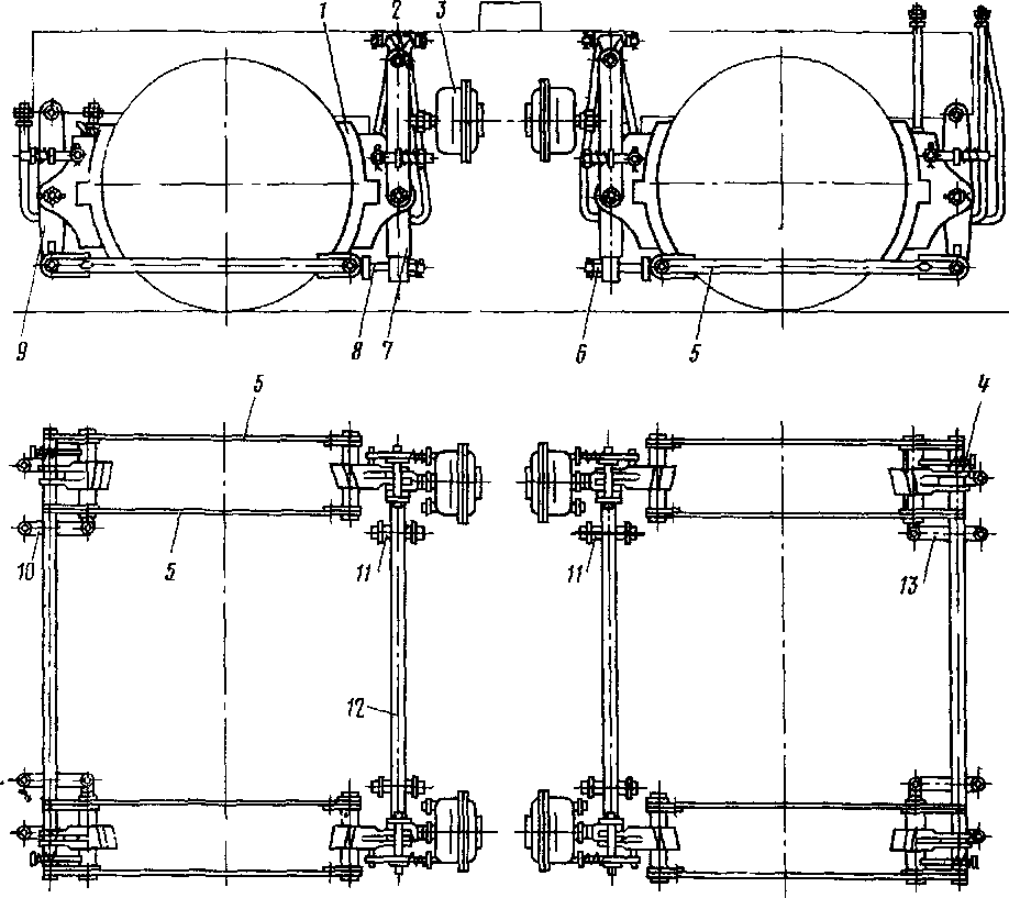 На концах планки имеют по три отверстия, с помощью которых выполняется грубая настройка зазора между колодками и колесом. Окончательный зазор устанавливается гайкой 6 регулировочного винта 8. Чтобы не возник разворот и сползание колодок с бандажей, рычажные передачи колес каждой колесной пары попарно связаны соединительными осями 12.