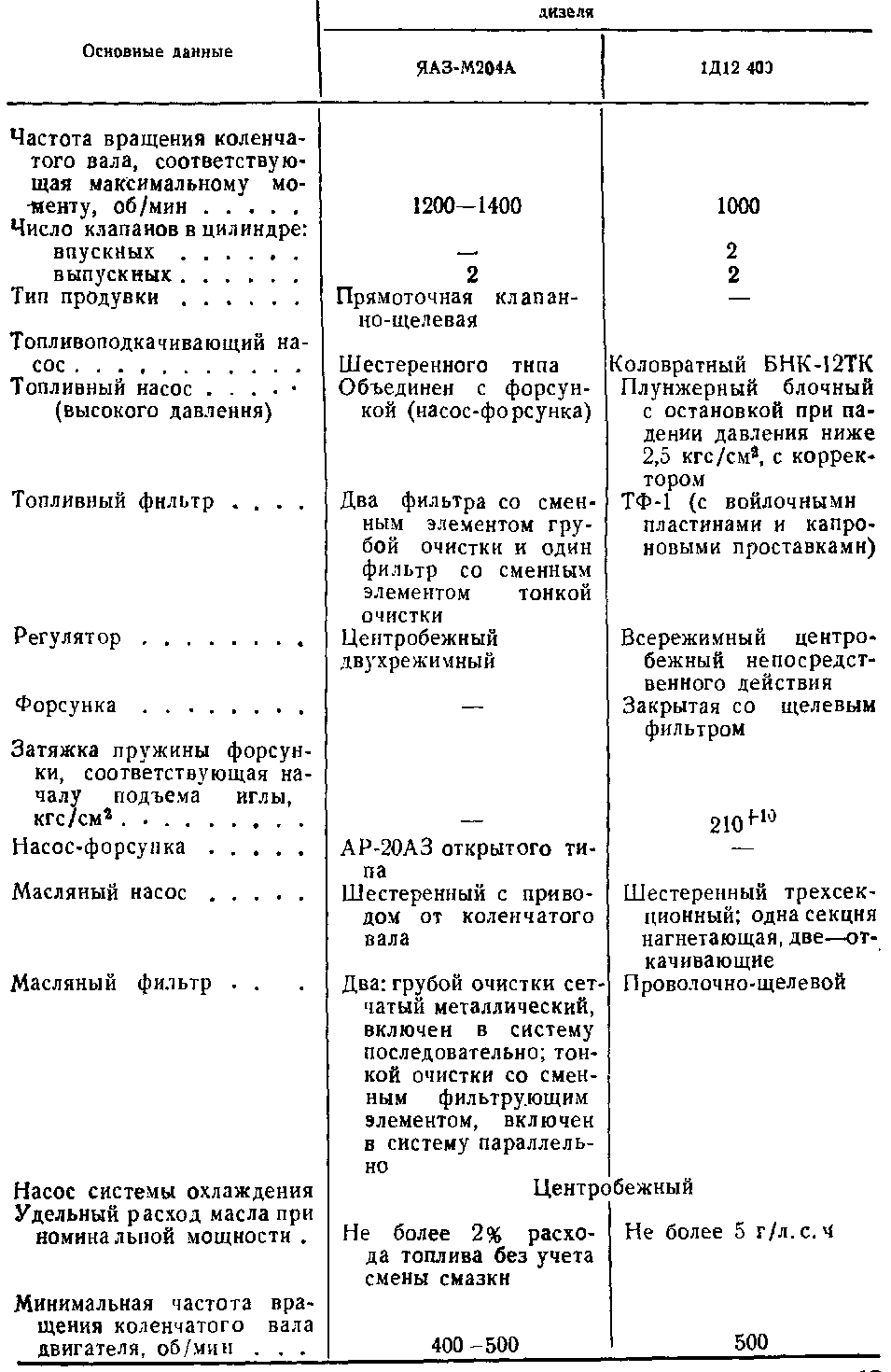 На тепловозах ТУ6А и ТУ7 установлены поршневые двигатели внутреннего сгорания с самовоспламенением жидкого топлива и цилиндре от горячего воздуха в конце такта сжатия. Такие двигатели называют дизелями. Основные технические данные дизелей ЯАЗ-М204А и 1Д12-400 приведены в табл. 2
