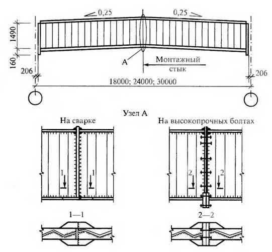 стенки — из тонкого листа, усиленного продольными ребрами- рифами. Монтажные стыки в примыкании ригеля к стойке и в середине пролета ригеля на фланцах выполнены с высокопрочными болтами (рис. 1.3).