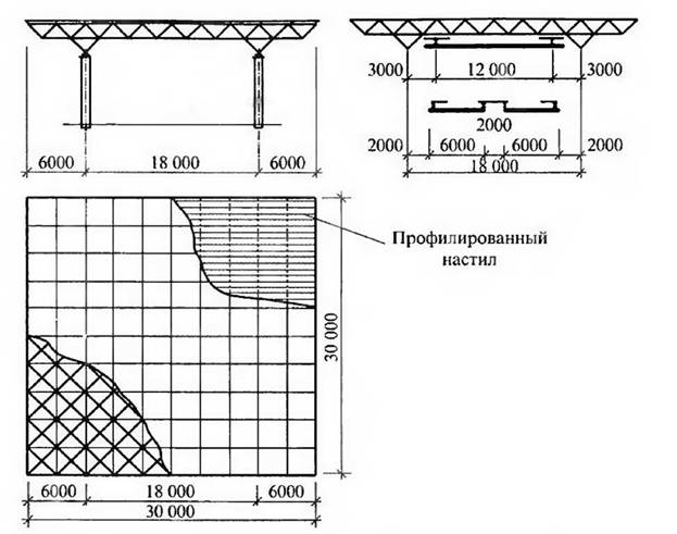 параллелепипеда, пирамиды и т.п. (рис. 1.8). Опоры структуры могут размещаться по контуру (регулярно или в углах), а также в пределах плана, образуя консольные вылеты покрытия. В некоторых случаях могут применяться многопролетные структуры.
