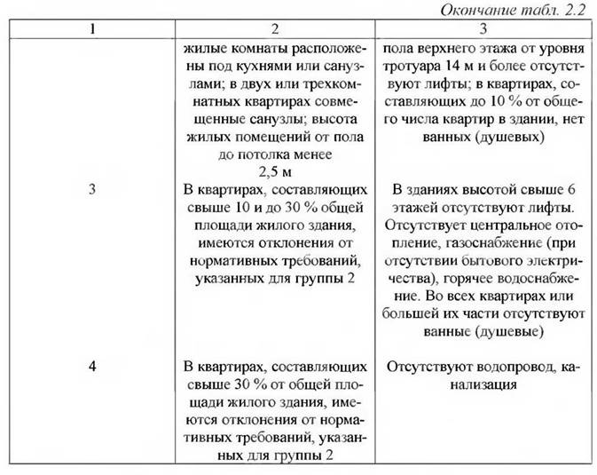 Примечание. Для отнесения жилого здания к определенной группе по соответствию нормативным требованиям к планировке и уровню инженерного благоустройства достаточно наличия одного из признаков, характеризующих эту группу. |