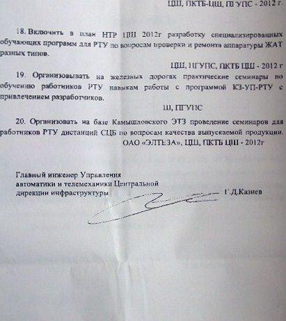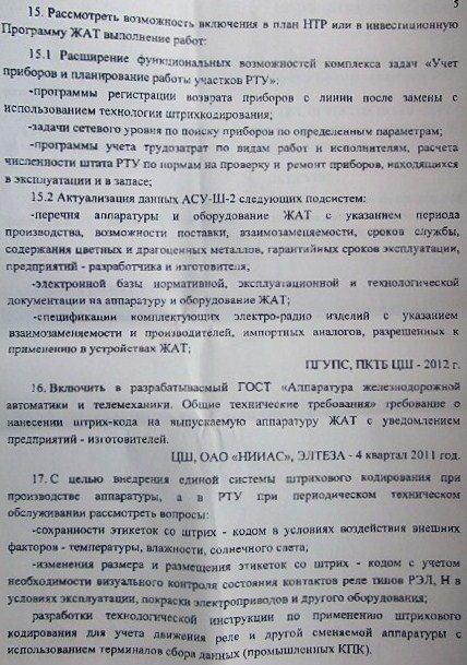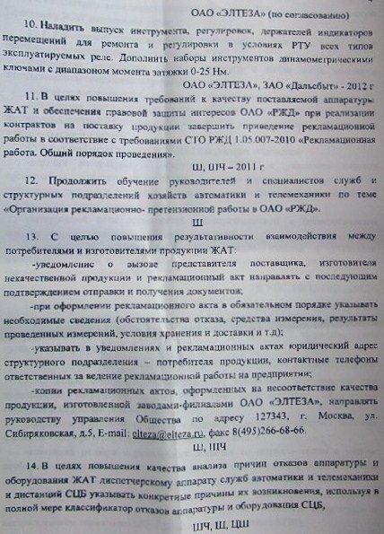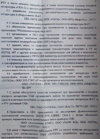 "Пункт 6.3 принять меры по снижению количества отказов контактов кодовых путевых трансмиттеров и маятниковых трансмиттеров, установить ТУ на КПТШ, МТ и другую аппаратуру, предназначенную для работы в импульсном режиме, согласованные с ПКТБ ЦШ параметры долговечности и безотказности."