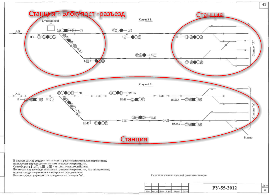 В ру-55-2012 лист43 как раз рассмотрены 2 случая, могут быть маршрутные светофоры, а могут быть точки автоблокировки, но там одна врезка, а у нас в пределах одного пути 2 врезки, и поэтому непонятки, если нумерация перед входным начинается заново, то получаются точки с одинаковой нумерацией в пределах одной станции, а если нумерацию продолжать, то как-то нелогично, перед входным будет точка 5-I.