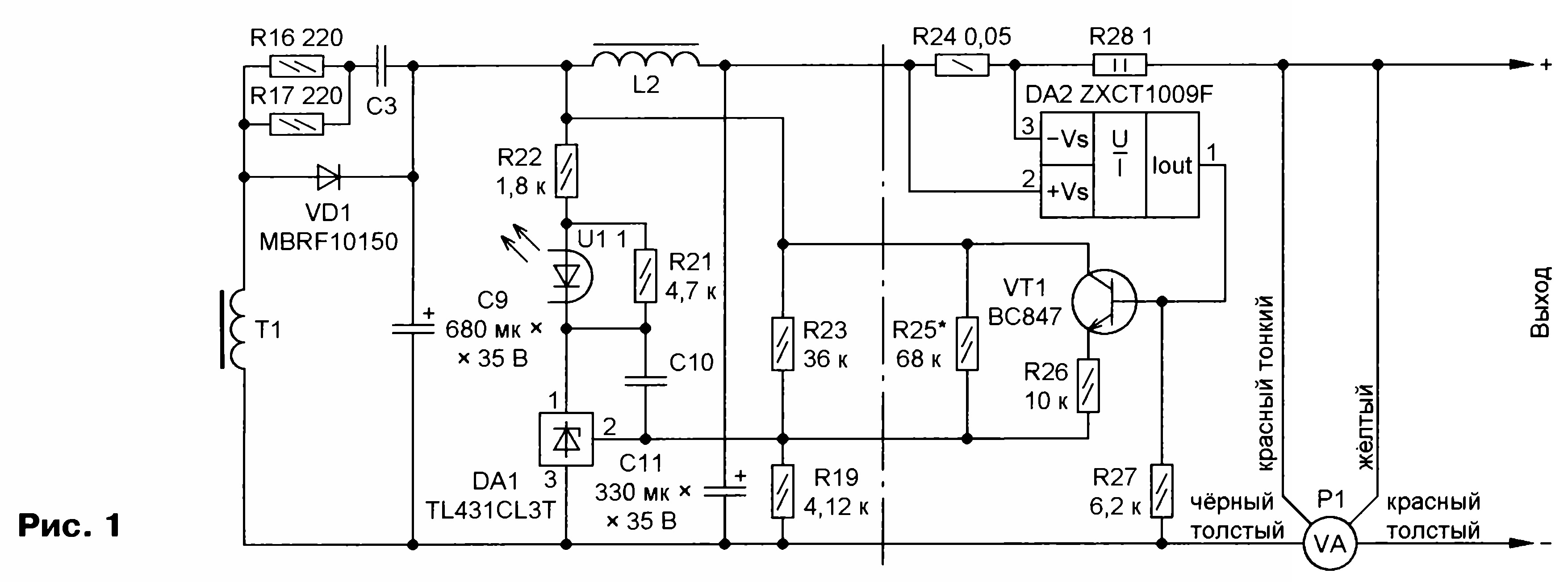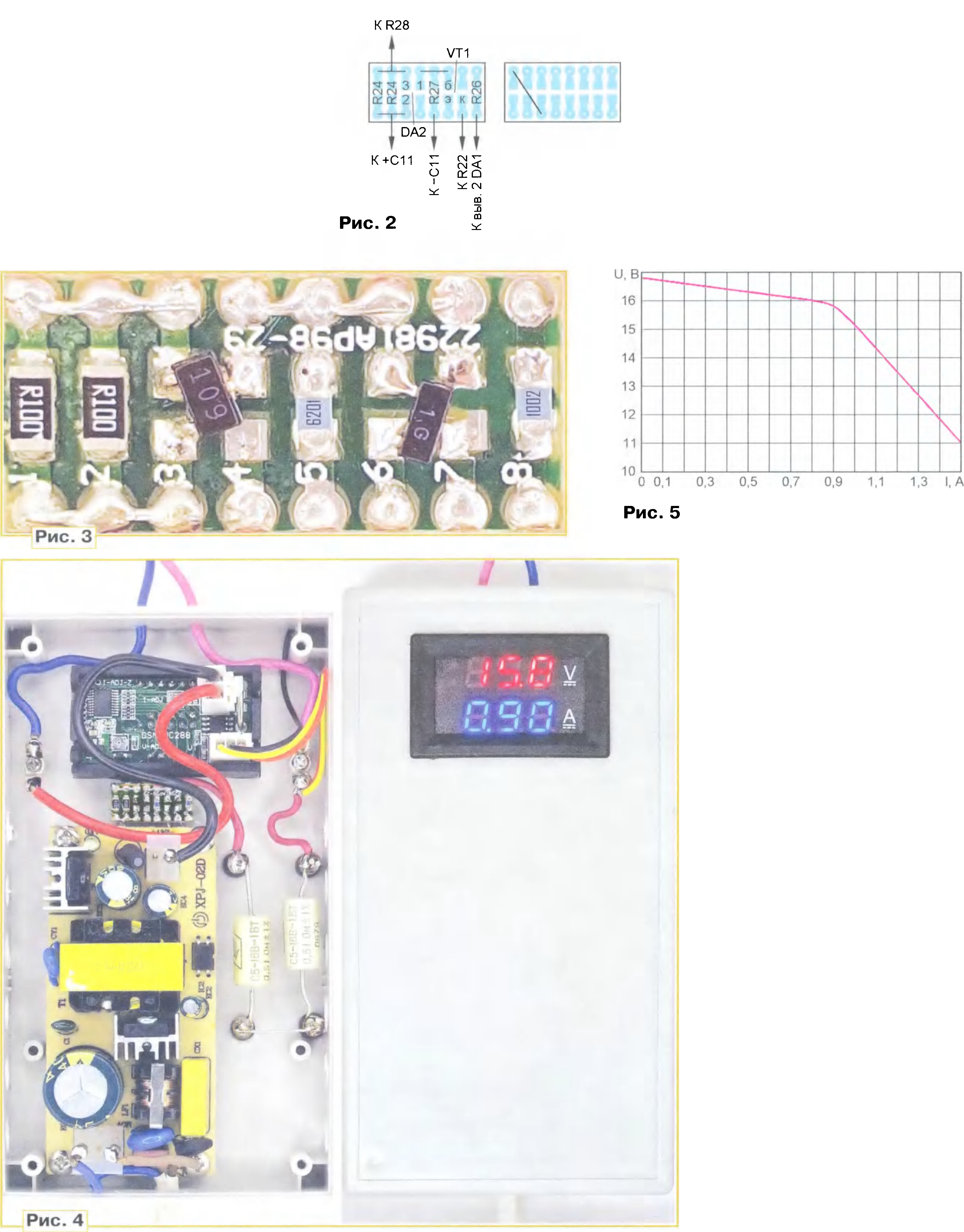 Тема: Ремонт автомобильного запускающего устройстваРемонт автомобильного запускающего устройства С. БИРЮКОВ, г. Москва В резервной Li-Ion батарее аккумуляторов NEOLINE, предназначенной для аварийного запуска автомобильного двигателя, вышла из строя плата узла управления, индикации уровня зарядки и питания USB-устройств, а собственно батарея с защитным контроллером осталась исправной. Выяснилось, что зарядку батареи можно осуществлять через выходные контакты, для чего было разработано новое зарядное устройство. качестве основы зарядного устройства использован преобразователь напряжения AC/DC 220/24 В, 1,5 А, приобретённый в АлиЭкспрессе, маркировка на плате преобразователя и на его трансформаторе — XPJ-02D. Преобразователь собран весьма добротно — на входе установлены предохранитель, варистор, помехо-подавляющий фильтр, во вторичной цепи предусмотрена RC-цепь, шунтирующая выпрямительный диод Шоттки, П-об-разный LC-фильтр, стабилизация выходного напряжения производится с помощью "регулируемого стабилитрона" TL431. ![]() В журнале "Радио" ранее было описано, как обеспечивать в импульсных преобразователях напряжения режим ограничения тока, если в них есть точка, которую можно считать входом подстройки и на которую можно подавать уменьшающий выходное напряжение втекающий ток [1]. Схема доработки источника приведена на рис. 1, показаны только его вторичные цепи. На схеме слева от вертикальной штрих-пунктирной линии — элементы импульсного источника питания. Микросхема DA2, транзистор VT1 и связанные с ними детали — дополнительные элементы, обеспечивающие переход источника в режим ограничения тока; Р1 — вольтметр-амперметр, позволяющий следить за зарядкой батареи. Напряжение на полностью заряженной батарее устройства составляло 16,8 В, что соответствует четырём последовательно соединённым Li-Ion аккумуляторам. Для исключения перезарядки аккумуляторной батареи напряжение на выходе преобразователя снижено до указанного значения установкой резистора R25 (нумерация добавляемых элементов продолжает существующую). Измеренная с помощью прибора [2, 3] ёмкость батареи оказалась равной 5 А’Ч. Точкой входа подстройки, как и в [1], является управляющий вход микросхемы DA1 (вывод 2), однако непосредственное подключение эмиттера транзистора токо-измерительной цепи, аналогичной применённой в [1] (резистор R24, микросхема DA2, транзистор VT1), к этой точке привело к крайне неустойчивой работе устройства из-за очень высокого усиления в цепи обратной связи. Стабильной работы удалось добиться установкой резистора R26 в эмиттерную цепь транзистора VT1 и резистора R28 в выходную цепь устройства. Их сопротивления являются компромиссом между поддержанием тока, изменяющегося в процессе зарядки батареи, и стабильностью работы устройства. В качестве токоизмерительного шунта R24 используются два резистора для поверхностного монтажа типоразмера 1206 сопротивлением 0,1 Ом, соединённые параллельно. Резистор R28 составлен из двух последовательно соединённых резисторов С5-16В сопротивлением 0,51 Ом и мощностью 1 Вт. Цифровой вольтметр-амперметр Р1 — трёхразрядный, приобретён в АлиЭкспрессе, его тонкий чёрный провод никуда подключать не надо. Детали, используемые для доработки, кроме резистора R28, установлены на печатной плате размерами 10,5x20,5 мм, приобретённой там же. На плате, на расстоян