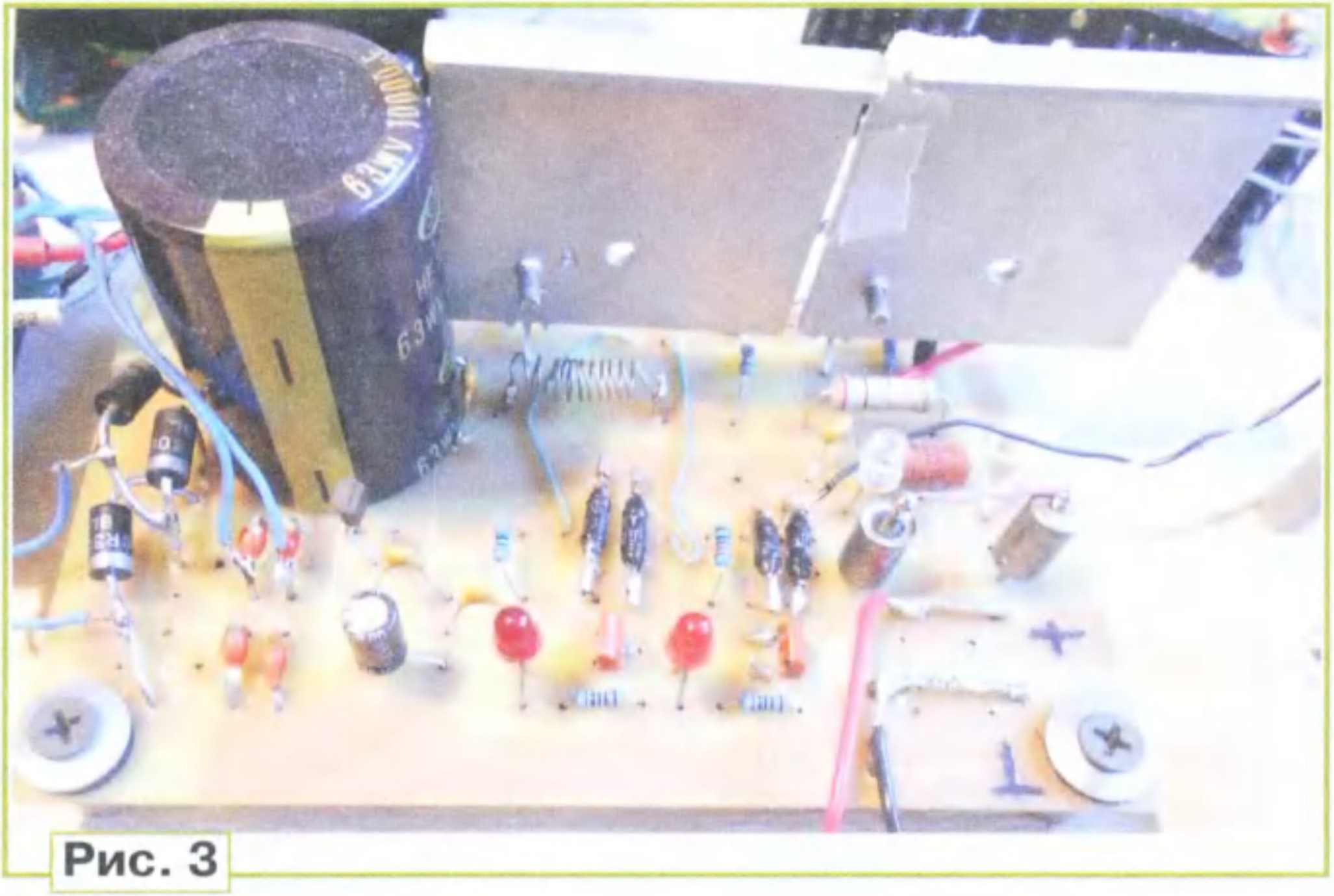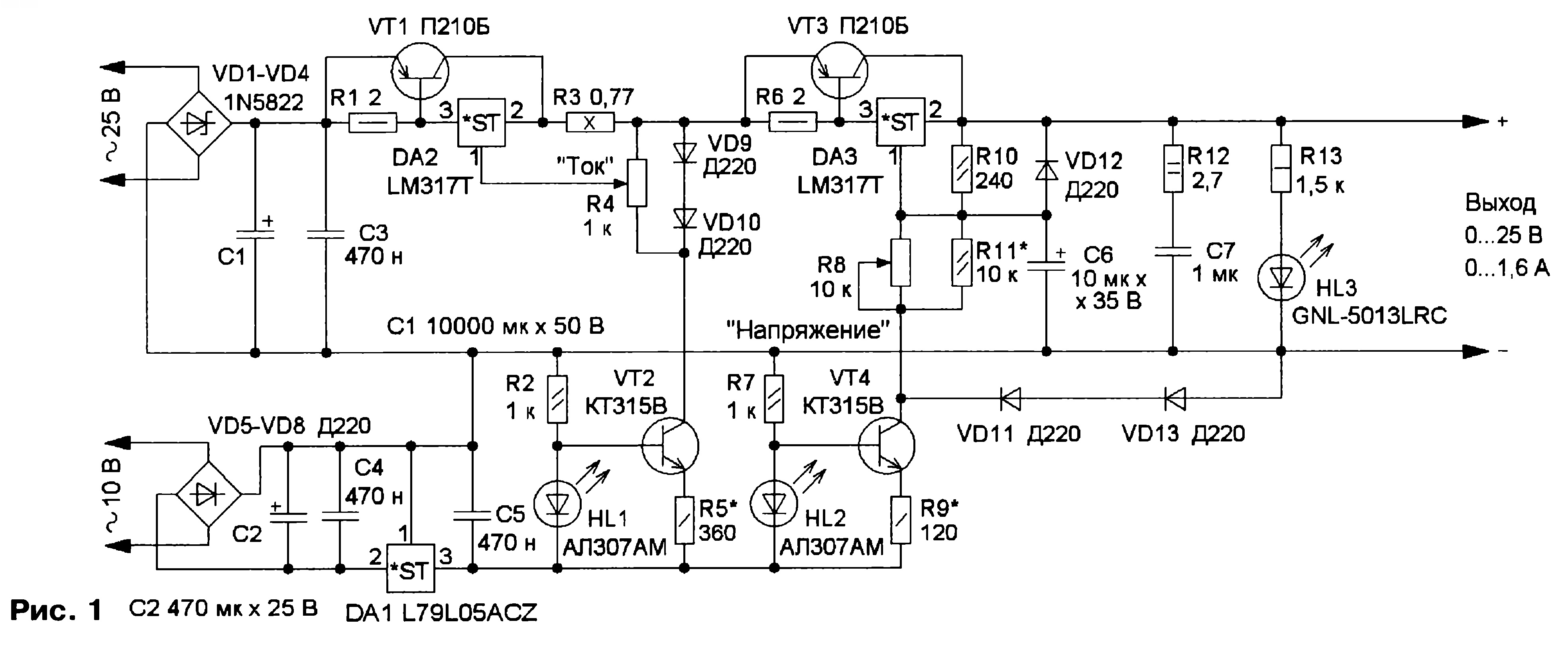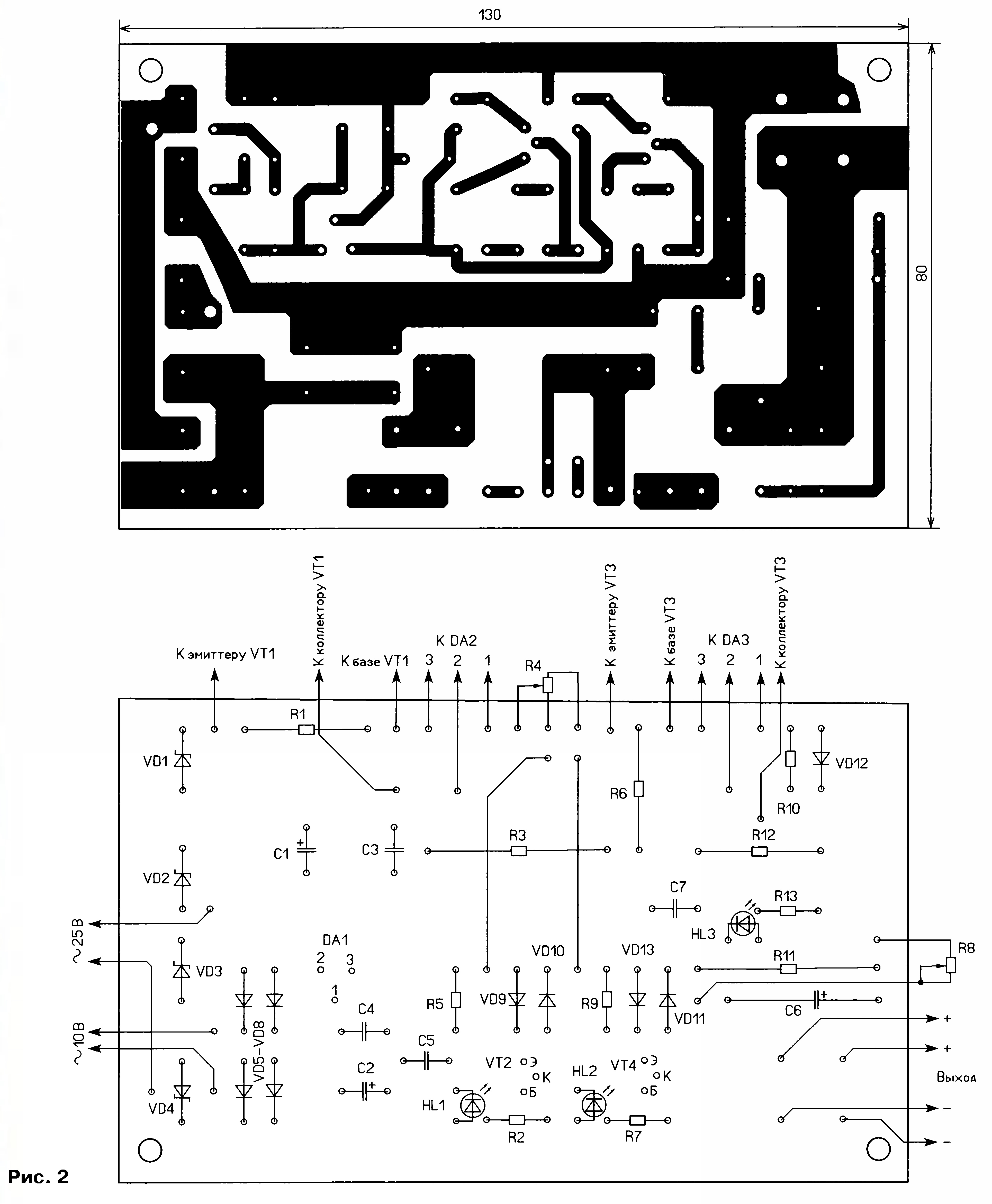 Тема: Регулируемый стабилизатор напряжения/тока для лабораторного блока питанияРегулируемый стабилизатор напряжения/тока для лабораторного блока питания С. СЕМИХАТСКИЙ, г. Ейск Краснодарского края На основе стабилизатора, описание которого приводится далее, можно собрать стабилизированный лабораторный блок питания с регулировкой выходного напряжения и тока. Схема устройства показана на рис. 1. Она была разработана на основе схемы из технического описания на микросхему LM317T [1]. В состав устройства входят включённые последовательно регулируемый стабилизатор (ограничитель) тока на микросхеме DA2 и транзисторе VT1, а также регулируемый стабилизатор напряжения на микросхеме DA3 и транзисторе VT3. Транзисторы VT1 и VT3 "берут" часть тока нагрузки на себя и тем самым облегчают режим микросхем DA2 и DA3. Интервал регулировки тока — 0...1.6 А, интервал регулировки выходного напряжения — 0...25 В. Регулировка тока осуществляется переменным резистором R4, регулировка напряжения — переменным резистором R8. ![]() ![]() Питаются стабилизаторы от мощного выпрямителя переменного напряжения на диодах VD1—VD4 и сглаживающем конденсаторе С1. От маломощного выпрямителя на диодах VD5—VD8 и конденсаторе С2 питается стабилизатор напряжения минусовой полярности на микросхеме DA1. Она обеспечивает питанием два стабилизатора тока, первый — на транзисторе VT2 и светодиоде HL1, второй — на транзисторе VT4 и светодиоде HL2. Первый стабилизатор обеспечивает током регулирующий вход микросхемы DA2, а второй — регулирующий вход микросхемы DA3. Благодаря этому стала возможной регулировка тока и напряжения от нуля. Светодиоды HL1 и HL2 индицируют наличие напряжения минусовой полярности. Светодиод HL3 повышенной яркости сигнализирует о наличии выходного напряжения. По яркости его свече ния можно судить о выходном напряжении, если оно станет меньше 1,5 В, светодиод погаснет. RC-цепь R12C7 повышает устойчивость работы микросхемы DA3 при изменении сопротивления нагрузки. В устройстве применены постоянные резисторы МЛТ или аналогичные импортные с допуском ±5 %, переменные резисторы — СПЗ-4аМ с функциональной характеристикой А. Резистор R3 изготовлен из нихромовой проволоки диаметром 0,3...0,5 мм. Концы провода запрессованы в штыри от разъёма РПКМ-Ш. Неполярные конденсаторы — К73-17, К10-17, конденсатор С6 танталовый — К52-1, остальные оксидные — К50-35 портные. Диоды 1N5822 можно заменить диодами SR306, SR560, диоды Д220 можно заменить диодами серий Д223, КД521, КД522. Транзисторы П210Б можно заменить транзисторами серий 1Т813, ГТ806. Транзисторы КТ315В можно заменить транзистором серий КТ315, КТ3102 с допустимым напряжением коллектор—эмиттер не менее 30 В. В блоке питания применён трансформатор ТПП268-127/220-50. Выводы 3 и 7 первичной обмотки соединены между собой, а напряжение 230 В подаётся на выводы 2 и 9. Выводы вторичной обмотки соединяют в следующей последовательности. Выводы 12 и 13 соединены, и переменное напряжение 10 В снимается с выводов 11 и 14. Выводы 16 и 17, 18 и 19, 20 и 21 соединены, а переменное напряжение 25 В снимается с выводов 15 и 22. Большая часть элементов установлена на печатную плату из одностороннего фольгированного стеклотекстолита толщиной 2 мм, её чертёж показан на рис. 2. В отверстия для подключения проводов "Выход" и "Общий" вставлены отрезки лужёного медного провода диаметром 1,2 мм, чтобы при частых перепайках фольга не отслаив