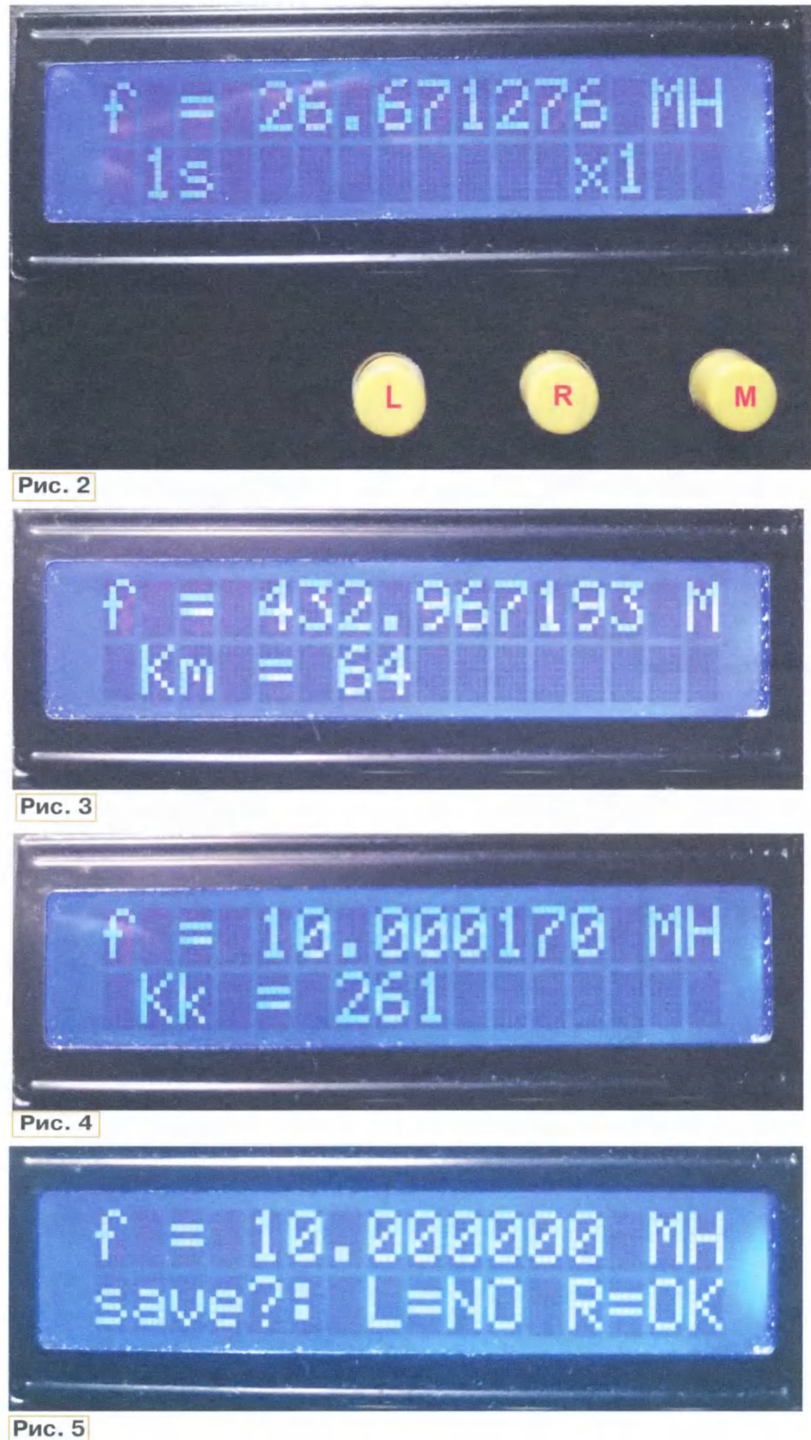 Тема: Усовершенствование частотомера на Arduino pro mini (ATmega 168)Усовершенствование частотомера на Arduino pro mini (ATmega 168) С. СИДОРЕНКО, г. Раменское Московской обл. Предлагаемое усовершенствование частотомера [1] состоит в установке трёх дополнительных кнопок управления и добавлении кода обработки в скетч. Зачем это нужно? Во-первых, для расчёта частоты при использовании ВЧ-щупа с делителем частоты на входе. Во-вторых, для оперативного управления коррекцией частоты без перепрограммирования микроконтроллера (МК). При этом значение коэффициента коррекции будем хранить в его EEPROM. ![]() Это значительно улучшит эксплуатационные характеристики частотомера. При выборе деталей для ВЧ-щупа с делителем частоты оказалось, что стоимость их может превышать стоимость самого частотомера. Бюджетный вариант можно построить на микросхемах серии SAB6456 [2] или U664 [3], а у них минимальный коэффициент деления равен 64. Естественно, расчёт частоты при этом выполняет МК. Схема ВЧ-щупа приведена на рис. 1, она достаточно широко представлена в Интернете. Его чувствительность в диапазоне 70 МГц...1 ГГц — 10 мВ. В диапазоне 30...70 МГц он также работает, но чувствительность ниже. При использовании элементов для поверхностного монтажа плата ВЧ-щупа без труда поместится вместе с экраном в корпусе от маркера. Теперь о доработке самого частотомера. Кнопки подключают между сво бодными контактами 2, 11, 12 модуля Arduino pro mini и общим проводом. Эти контакты программно подтянуты к плюсовой линии питания (INPUT PULLUP). Условно обозначим их "М" (контакт 2), "R" (контакт 12) и "L" (контакт 11). У моего частотомера они расположены справа налево. Программный таймер антидребезга для каждой кнопки свой. Он подсчитывает число циклов loop, так как команды millis() и delay() нам не доступны. В нашем случае так делать можно, так как задержка на расчёт частоты и отображение её на дисплее не превышает 15 мс, а длительность антидребезга, задаваемая переменной T_out = 20000, составляет около 350 мс. Она же и задаёт период повтора. Информация об измеряемой частоте выводится в первой строке LCD-экрана, вторая строка — служебная. На ней отображаются настраиваемые параметры частотомера (пункты меню). Выбираем пункты меню с помощью кнопки "М". В режиме измерения на второй строке отображено время измерения — "1s" и множитель "х1" (рис. 2). При "х1" ВЧ-щупа-делителя нет. ![]() В режиме установки коэффициента деления Кт кнопками "L" и "R" уменьшают или увеличивают его значение (рис. 3). Максимальное значение Кт = 255. В режиме установки переменной Кк (коррекция показаний) кнопками "L" и "R" уменьшают или увеличивают её значение, которое может быть в интервале от -32767 до 32767. При этом измерение частоты продолжается (рис. 4). При удержании кнопки более 20 тактов измерения значения будут изменяться десятками, ещё через 20 тактов будут изменяться сотнями для ускорения процесса установки. Число тактов задаётся в переменной Vol. Теперь значение Кк можно корректировать при измерении любой стабильной частоты с известной погрешностью, добиваясь равенства показаний. При выходе из режима установки Кк, если изменено значение, будет выведен запрос на сохранение изменений в EEPROM save?: L=NO R=OK (рис. 5). При нажатии на кнопку "R" значение сохранится, при нажатии на кнопку "L" или "М" — нет. Таким образом, частотомер стал более совершенным устройством с возможностью измерения частоты от 10 Гц до 1 ГГц. ЛИТ