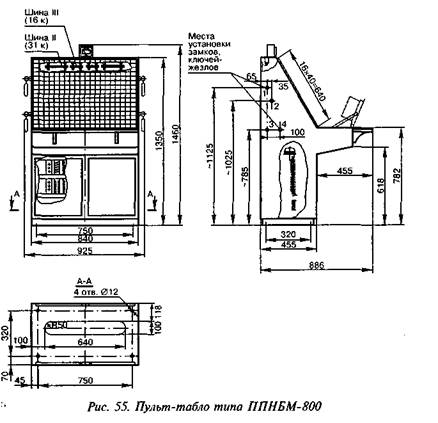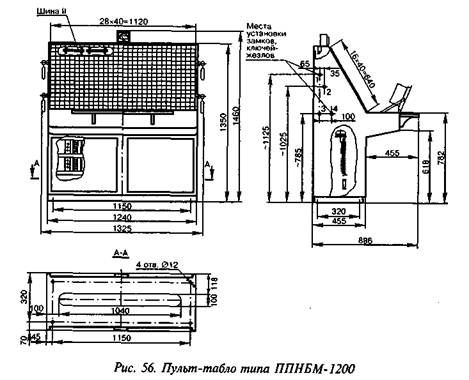 С лицевой стороны пульт-табло также имеет съемные щиты для доступа к заводскому монтажу клеммных панелей. На горизонтальной части пульта установлена поворотная рама с монолитной панелью под аппаратуру управления. Рама поворачивается на петлях в сторону оператора на 115°.