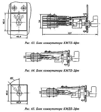 В блочных пультах ППНБ устанавливаются блоки коммутаторов трехпозиционных типа КМТБ-4фт, черт. 15899-07-00 и КМТБ-2фт, черт. 15899-07-00-01, которые были разработаны для блочных пультов на базе трехпозиционного коммутатора, черт. 170-00-00А (404-00-00). Нумерация контактов блоков коммутаторов типа КМТБ-4фт и КМТБ-2фт приведена в табл. 61.