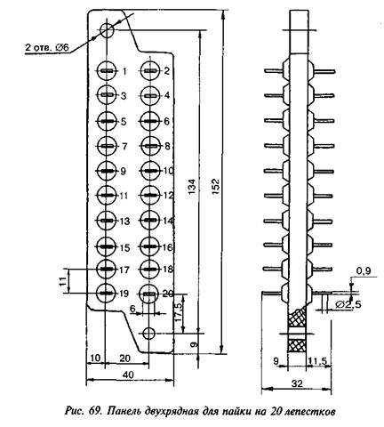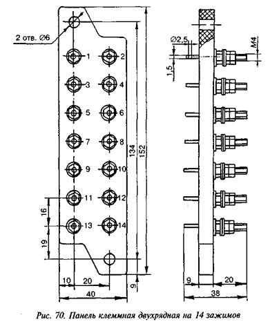 Панель клеммная двухрядная на 14 зажимов допускает подключать к шпилькам провода сечением до 6 мм2, при этом количество проводов под один зажим не более двух, а суммарный ток через шпильку не должен превышать 15 А. К паечному концу может быть присоединен либо один провод сечением до 2,5 мм2, либо два провода сечением до 1 мм2.