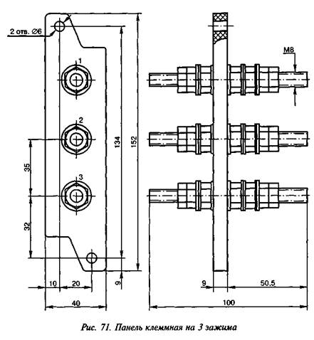 Панель клеммная на 3 зажима допускает подключать провода сечением до 35 мм2, снабженные кабельными наконечниками, при этом количество проводов может быть не более двух на каждую пару контактных шайб, а суммарный ток через шпильку не должен превышать 70 А.