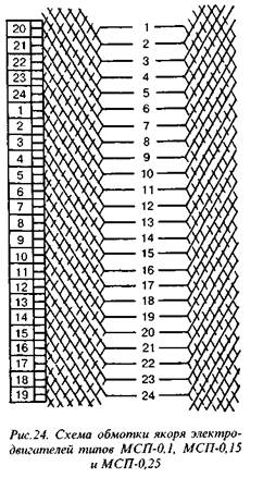 Схема обмотки якоря приведена на рис. 24, где шаг по пазам 1—12, шаг по коллектору 1-2.