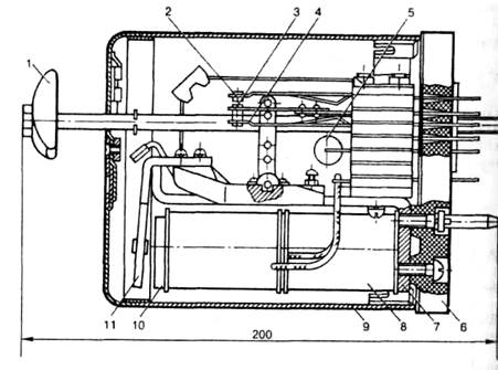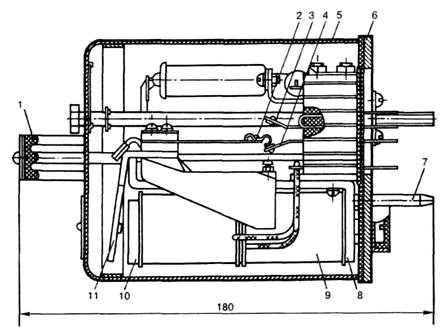Некоторые конструктивные особенности. Основными деталями аварийных малогабаритных штепсельных реле типа АШ2 (рис. 138) являются: 1 — ручка; 2 — фронтовой контакт; 3 — общий контакт; 4 — тыловой контакт; 5 — диод; 6 — основание; 7 — ярмо; 8 — катушка; 9 — колпак; 10 — сердечник; 11 — якорь.