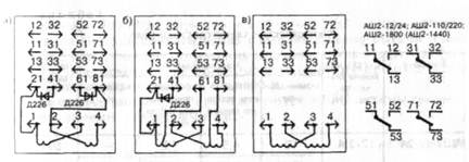 Схемы включения обмоток реле типов АШ2-12/24, АШ2-110/220 м АШ2-1800 (АШ2-1440) приведены соответственно на рис. 139, а, 6, в.