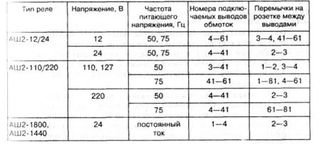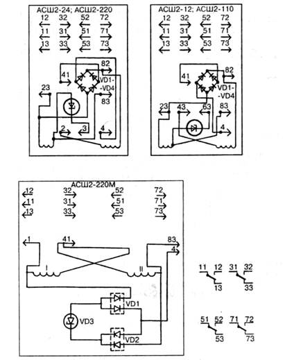ются для реле АСШ2-12 и АСШ2-110 между контактными выводами 43—63, для реле АСШ2-24 и АСШ2-220 — между выводами 2—3, для реле АСШ2-220М — между выводами 3—41.
