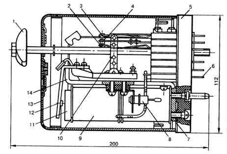 Некоторые конструктивные особенности. Основными деталями реле АСШ2 (рис. 142) являются: / — ручка; 2 — тыловой контакт; 3 — фронтовой контакт; 4 — перекидной контакт; 5 — основание; 6 — нож; 7— прокладка; 8 — стабилитрон; 9— катушка; 10 — тяга; 11 — сердечник; 12 — якорь; 13 — колпак; 14 — ярмо.