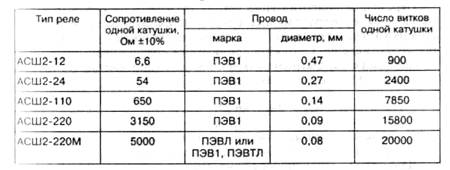 Обмоточные данные реле АСШ2 при температуре +20°С должны соответствовать данным, указанным в табл. 132.