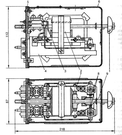 Некоторые конструктивные особенности. Основными деталями реле ИМШ (рис. 145) являются: 1 — ручка, 2 — постоянный магнит, I катушка, 4 — корпус, 5 — основание, 6 — колпак, 7 — магни-топровод, 8 — неподвижные контакты, 9 — якорь с подвижными контактами. Реле ИМВШ, кроме перечисленных деталей, имеет панель с диодами. Импульсные реле являются электромагнитным поляризованным механизмом с мостовой магнитной системой.