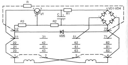 Некоторые конструктивные особенности. Реле РКС-5 (черт. 7584-ООМЧ) изготавливается на базе штепсельного реле типа НМШМ2-1500, изменив схему включения реле. Схема реле РКС-5 приведена на рис. 161. В схеме применены и вмонтированы в корпус реле: VD1, VD2 — диоды Д226Б (КД-105Б); R — резистор МЛТ-2-1-5,6 кОм (подбирается при настройке). Номинальное напряжение переменного тока 120 В подается на выводы 1—3. Напряжение притяжения — не более 85 В, напряжение отпадания — не менее 20 В. Перегрузка — 150 В. Выводы 2—4 предназначены для измерения напряжения непосредственно на катушке реле.