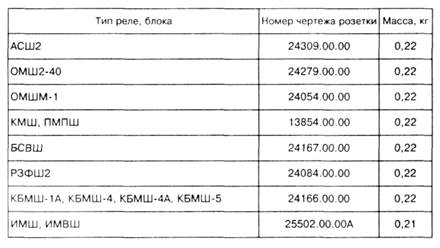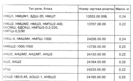 Номера чертежей и масса розеток для реле и блоков различные типов следующие:
