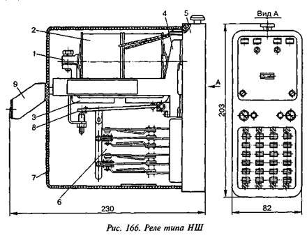 Некоторые конструктивные особенности. Основными деталями реле НШ (рис. 166) являются: 1 — сердечник, 2 — катушка, 3 — полюсные наконечники, 4 — кронштейн, 5 — основание, 6 — контактная система, 7 — колпак, 8 — якорь, 9 — ручка. Реле постоянного тока являются электромагнитными двухпозиционными. Обмотки реле типа НШ размещены на двух шпулях, изготовленных из пластмассы.