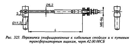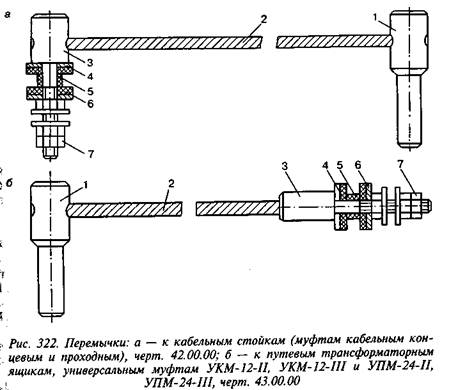 Перемычки к кабельным стойкам (черт. 42.00.00) предназначены для соединения кабеля кабельной стойки с рельсовой цепью (рельсами). Такая перемычка (рис. 322, а) состоит из деталей: / — штепселя, 2 — гибкого троса, 3 — контактного болта, 4 и 6 — изоляционных шайб, 5— изоляционной втулки, 7— гайки с резьбой Мб.