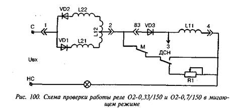 Схема проверки работы реле 02-0,33/150 и 02-0,7/150 в мигающем режиме приведена на рис. 100. Реле должны устойчиво работать при мигающем режиме питания по данной схеме: