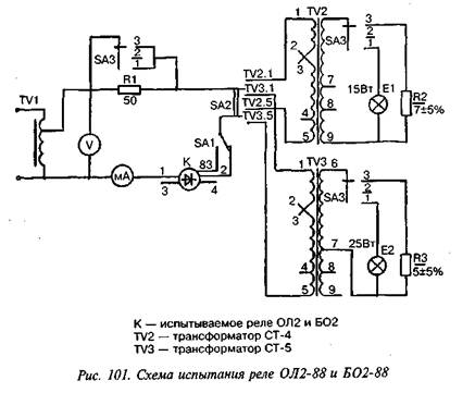 Схема испытания реле ОЛ2-88 и Б02-88 приведена на рис. 101. Проверку токов срабатывания и отпускания реле на переменном токе производят приборами класса точности не хуже 2,5 при следующем положении переключателей: SA1 — 2, SA2 — TV-2, SA3 — 3 — для схемы контроля с трансформатором СТ-4 и лампой 15 Вт, 12 В; SA1 — 1, SA2 — TV-3, SA3 — 3 — для схемы контроля с трансформатором СТ-5 и лампой 25 Вт, 12 В. Проверку напряжения срабатывания и отпускания на постоянном токе производят приборами класса точности не хуже 1,5. На катушки реле подают ток или напряжение, равное предельно допустимому при эксплуатации, указанному в табл. 100. Напряжение или ток плавно уменьшают до тех пор, пока якорь не разомкнет все замыкающие контакты. Полученную при этом величину принимают за напряжение или ток отпускания. Затем напряжение или ток уменьшают до нуля, цепь питания кратковременно прерывают и на катушки реле в том же направлении подают напряжение или ток, которые плавно повышают до тех пор, пока якорь не притянется до упора. Полученное значение принимают за напряжение или ток срабатывания.