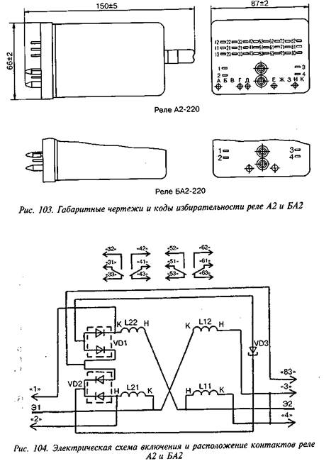 Предусмотрена избирательность реле с целью исключения ошибочной установки реле одного типа вместо другого. Коды избирательности реле приведены на рис. 103. Конструкция реле А2, БА2 аналогична описанной ранее конструкции реле 02 и Б02. Отличается реле параметрами контактной системы, схемой включения и обмоточными данными.
