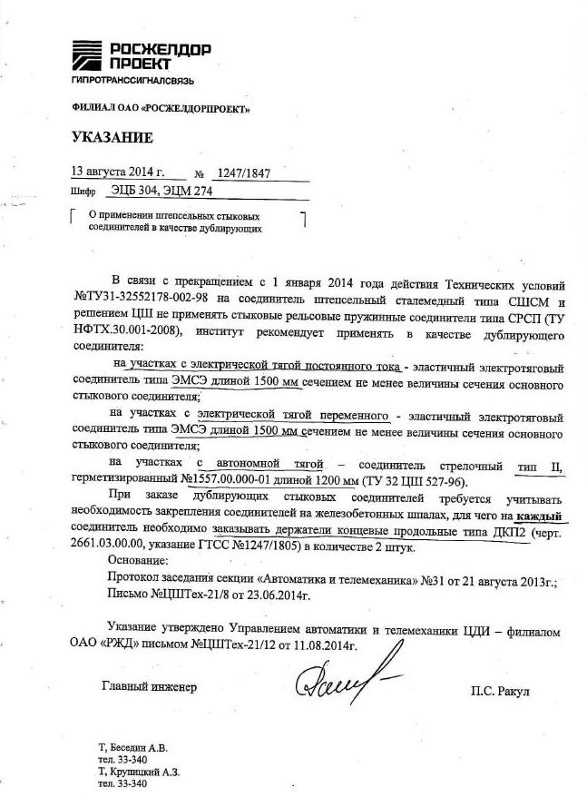 ЦЗ Целько исх-9488 от 22.06.2015г об установке СРСП с 01.07.2015г на перегонах,станционных путях,бесстрелочных изолированных участках без всяких приварных и электротяговых.........Вот так...