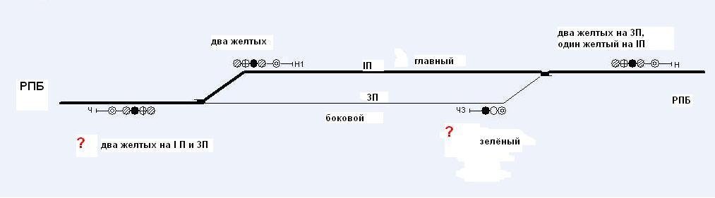 [IMG] [/IMG]Проблема в том: - жирной линией выделен, так называемый главный путь; - путь 3П - считается боковым; - входной "Ч" сигнализирует "два жёлтых" на IП и 3П - это вопрос? Логично ли? - ыходной "Ч3" сигнализирует зелёным - это вопрос? Правильно ли?