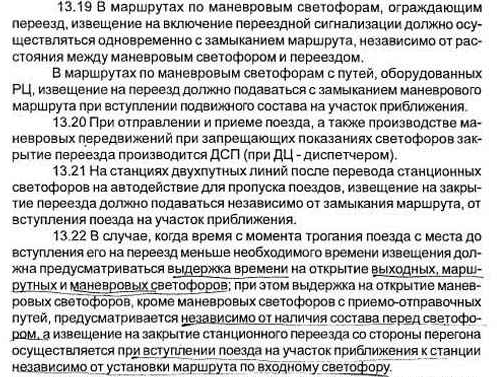 Чо-то не пойму логику Витоса, вроде понятно написано и здесь как раз пункты 13.19 и 13.22 не противоречат друг другу, так как написано в 13.19, что извещение подается с замыканием маршрута, а открытие светофора может быть с задержкой (п.13.22).