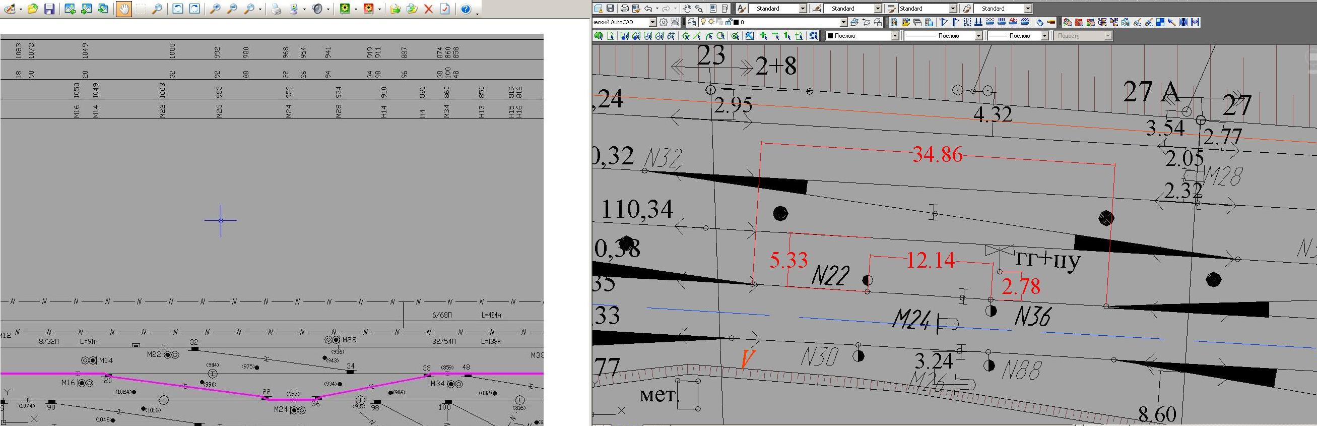 Судя по съемке, 12,5 между рамными рельсами там нет! Кроме того, будет ли в габарите опора ГГС? Привожу реальную съемку станции. Расстояние между приводами даже не 14 метров, как указано на существующем схемплане.