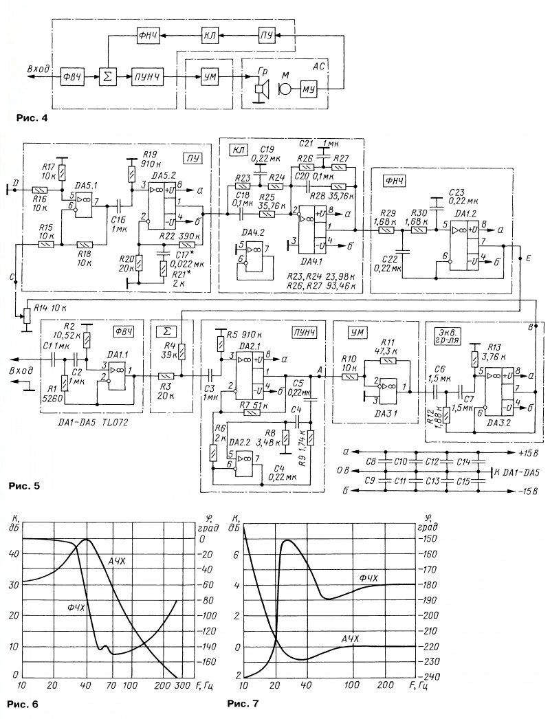 Тема: [07-2015] Применение электроакустической обратной связи в активных АСПрименение электроакустической обратной связи в активных АС А. СЫРИЦО, г. Москва В статье автор рассматривает виды обратной связи, охватывающей усилитель мощности, которая учитывает и некоторые свойства излучателей акустической системы, исправляя в определённой степени недостатки АС. Электроакустическая обратная связь (ЭАОС) наиболее эффективно снижает различные искажения в полосе НЧ, однако применимость такой технологии ограничена лишь в АС с встроенными УМЗЧ. Автор предлагает краткую методику расчёта такой АС и схемы дополнительных электронных узлов. Заметим, что автор неоднократно представлял на выставках свои активные АС (с встроенными УМЗЧ и ЭАОС). Они отличаются реалистичностью звучания и особой чистотой в басовом регистре, где и действует ЭАОС. реди основных проблем высококачественного звуковоспроизведения (ЗВ) в полосе НЧ через акустические системы (АС) с электродинамическими головками (ЭДГ) можно выделить две основные: искажения АЧХ и ФЧХ, а также большая величина нелинейных искажений (НИ), особенно на низких частотах. Причинами первой из них являются компромиссы в выборе громкоговорителей, их акустического оформления (АО), а также акустическими свойствами комнаты для прослушивания (КдП) и местом размещения в ней АС. Результатом этого вида искажений являются искажения переходной характеристики (ПХ), что выражается в искажении огибающей звукового сигнала, особенно при резких изменениях уровня, они обычно характеризуются как эффекты "размытости”, "гудения" и "запаздывания баса". Основная причина второй проблемы заключается в необходимости значительного увеличения смещения (хода) диффузора ЭДГ, что особенно подчёркивается при его недостаточной жёсткости и приводит к появлению дополнительных призвуков. Методы снижения искажений в АС Ниже кратко рассмотрены возможности применения различных методов по преодолению или уменьшению этих проблем в наиболее распространённых типах АС с АО в виде фазоинвертора (ФИ) и закрытого ящика (ЗЯ), но без учёта влияния акустики КдП и места размещения в ней АС. АС с АО в виде ФИ при корректной реализации позволяет значительно расширить АЧХ в области нижней граничной частоты в полосе ЗВ, а также уменьшить НИ и, что особенно важно, при относительно небольших объёмах АС, по сравнению с АС в виде ЗЯ. Однако все эти достоинства сопровождаются существенными искажениями ПХ, которые часто являются главными критериями при оценке качества ЗВ, конечно, с учётом заданного функционального назначения АС. Значительно лучшей ПХ обладает АС с АО в виде ЗЯ, однако при этом требуется значительное увеличение объёмов АС при уменьшении нижней граничной частоты в полосе ЗВ. Для улучшения качества ЗВ через АС с этими двумя видами АО наиболее часто применяется совместная коррекция АЧХ и ФЧХ [1], а также их совместное использование с усилителями мощности (УМ), обладающими отрицательным выходным сопротивлением [2], что существенно улучшает ПХ за счёт лучшего демпфирования ЭДГ. Другой метод, менее распространённый, но весьма эффективный, рассчитан на использование электромеханической обратной связи (ЭМОС). В этом случае принципиально, что цепью ОС охватывается ЭДГ — основной источник всех видов искажений, которые при этом методе