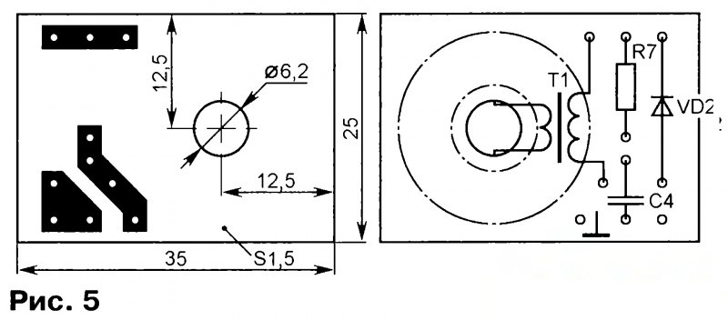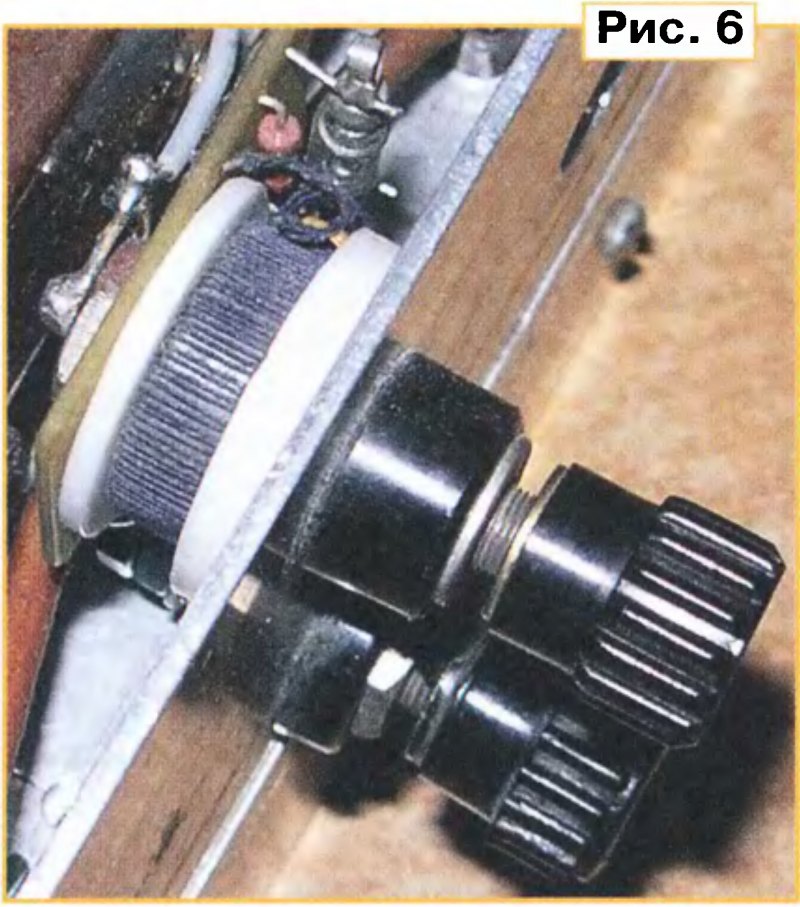 Тема: [07-2015] Индикатор настройки передатчика на основе "зелёного глаза"Индикатор настройки передатчика на основе "зелёного глаза" С. КОМАРОВ, г. Москва Одна из задач при конструировании радиопередатчика — разработка удобного индикатора настройки. Далеко не всегда для этого нужен стрелочный прибор, чаще вполне достаточно индикатора типа "Больше — Меньше", функцию которого с успехом может выполнить вакуумный электронно-световой индикатор. Вторая задача — как максимально просто оценить ток антенны, не "отъедая" при этом мощности от выходного сигнала? В статье описан изящный вариант решения этих задач. Предлагаемыи индикатор предназначен для радиопередатчиков диапазонов НЧ, СЧ и нижней части ВЧ (приблизительно до 10 МГц), преимущественно работающих на открытые проволочные антенны, которые подключаются непосредственно к антенной клемме без фидерного тракта. Помимо тока антенны, при эксплуатации передатчика представляет интерес уровень сигнала модуляции. Особенно это актуально для АМ-передатчиков. Схема устройства представлена на рис. 1. Оно состоит из датчика тока антенны (элементы Т1, R7, 04, VD2) и собственно индикатора (все остальные), который, в свою очередь, содержит два канала индикации ("Ток модуль антенны" и "Модуляция"), переключаемые тумблером SA1. Модулирующее напряжение на индикатор можно взять с отвода модуляционного трансформатора или с экранирующей сетки лампы выходного каскада передатчика. Резисторами R4 и R5 подбирают чувствительность каналов индикации. В канале тока антенны максимальные показания индикатора должны соответствовать рабочему току при минимальном значении активного сопротивления нагрузки, на которое рассчитан передатчик. Как правило, у самых плохих используемых в любительской практике антенн ("верёвка") это значение лежит в пределах 10... 18 Ом (для примера, четвертьволновый наклонный луч имеет активное сопротивление приблизительно 30 Ом, а сопротивление полуволнового, повешенного в реальных условиях городского квартала между домами, может доходить до 300 Ом и более). Перехлёст индикатора говорит об аварии антенны (падение или замыкание на местные предметы) либо о значительной расстройке (на провод антенны уселась стая птиц). В канале модуляции смыкание лепестков должно соответствовать 100 % глубине модуляции, а перехлёст указывает на появление искажений на пиках модуляции. Впрочем, этот же индикатор, но лишь с одним каналом, может быть с успехом использован для индикации уровня сигнала в ламповых УМЗЧ. Подробное описание принципа работы и особенностей схемотехники включения электронносветовых индикаторов приведено в статьях [1,2]. ![]() Размещение индикатора на передней панели передатчика и конструкция крепления к ней должны быть подчинены удобству его эксплуатации. Начнём с того, что для удобства пользования индикатор следует разместить слева-сверху, чтобы при работе с органами управления правой рукой не загораживать себе обзор (для левшей — наоборот). При этом через окошко в передней панели (его форма и размеры для 6Е1П показаны на рис. 2,а) должен быть виден светящийся экран в широком углу наблюдения. Лампу индикатора следует размещать как можно ближе к панели (идеально — вплотную), совместив нижнюю границу видимости экрана внутри лампы с низом окошка. Переключатель SA1 желательно установить в непос