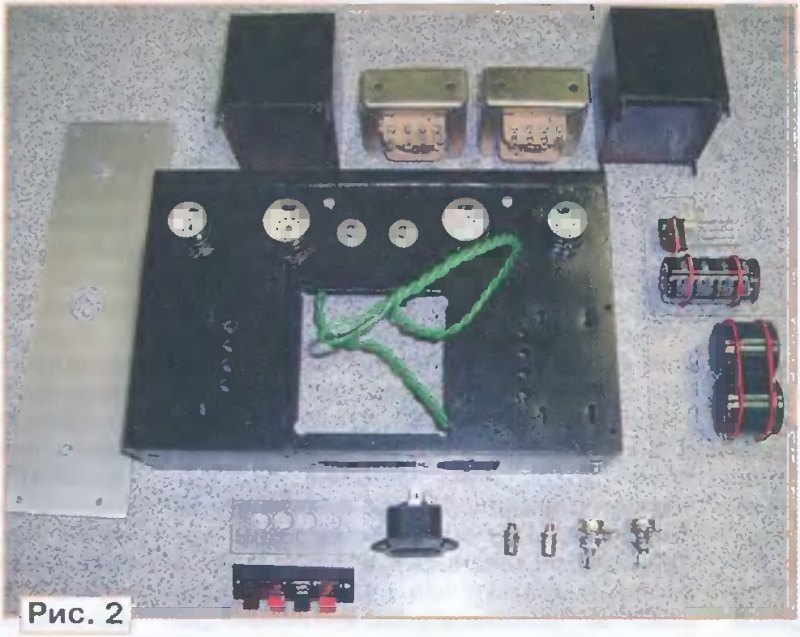 Тема: [08-2015] Однотактный стереоусилитель на пентодахОднотактный стереоусилитель на пентодах О. ПЛАТОНОВ, г. Пермь При создании этого усилителя ставилась задача сделать максимально простую конструкцию с хорошими параметрами и приличным дизайном, пригодную для повторения начинающими радиолюбителями. В усилителе применены только готовые моточные узлы (сетевой и выходные трансформаторы, дроссель) от бытовой ламповой аппаратуры прошлого века. Схема одного из каналов усилителя приведена на рис. 1. Входной сигнал поступает на регулятор громкости R1 и далее через конденсатор С1 на управляющую сетку лампы VL1. Пентод 6Ж1П был выбран из соображений экономичности (ток накала лампы — 180 мА), недефицитности и приличных параметров (эта лампа использовалась в микрофонных усилителях профессионального применения). С резистора нагрузки R3 через конденсатор С4 усиленный сигнал поступает на управляющую сетку лампы выходного каскада VL2. Лампа VL2 работает с автоматическим смещением, но в цепь её катода включён источник тока на микросхеме КР142ЕН5В (стабилизатор напряжения + 5 В). Вход стабилизатора подключён к выводу катода лампы, а к его выходу подключён токозадающий резистор R9. При сопротивлении резистора 100 Ом ток анода лампы VL2. Переключатель SA1 в цепи питания экранной сетки VL2 позволяет выбирать режим включения лампы — пентодный или триодный. В пентодном режиме максимальная выходная мощность усилителя составляет около 2 Вт на нагрузке 8 Ом в полосе рабочих частот 120 Гц.,.25 кГц по уровню -3 дБ. В три-одном включении мощность усилителя — не менее 1 Вт на нагрузке 8 Ом и полосе 40 Гц...12,5 кГц по уровню -3 дБ. Помимо различий в электрических характеристиках режимов, существенно отличается и характер звучания. ![]() Усилитель собран на шасси, представляющем собой стальную раму размерами 240x150х х54 мм, припаянную к стальному листу размерами 240х150х х0,7 мм, в котором предварительно вырезаны необходимые отверстия для установки радиоламп, сетевого и выходных трансформаторов, для вентиляции. Места пайки листа и рамы тщательно промыты, зачищены и зашпаклёваны полиэфирной автомобильной шпаклёвкой, после чего всё шасси загрунтовано и покрашено автомобильной эмалью (рис. 2). ![]() Выходные трансформаторы помещены в стальные экраны. Это, скорее, эстетическая, чем техническая необходимость. Для этой цели были найдены подходящие металлические коробки, внутри которых по углам были припаяны винты М3 с предварительно отпиленными головками. Винты должны выступать наружу за край коробки на 6.. 8 мм, с их помощью коробки крепятся к шасси с нижней стороны четырьмя гайками М3. Экраны трансформаторов также загрунтованы и покрашены автоэмалью. Фронтальная панель усилителя вырезана из алюминиевого листа марки АМГ-5 толщиной 1,5 мм, отполирована мелкой наждачной бумагой под струёй тёплой воды и покрыта бесцветным автомобильным лаком. На панели установлены сетевой выключатель с подсветкой и регуляторы громкости каналов Панель имеет размеры 240x65 мм, её верхняя кромка выступает над шасси на 10 мм. На задней стенке шасси установлены сетевой разъём с предохранителем, нажимной клеммник WP4-18FB для подключения акустических систем и два RCA гнезда RS-104 или RS-115 (типа тюльпан) входов левого и правого каналов. Монтаж усилителя начинают с прокладки цепей питания накала ламп перевитой парой проводов. Все