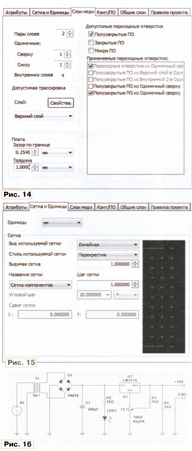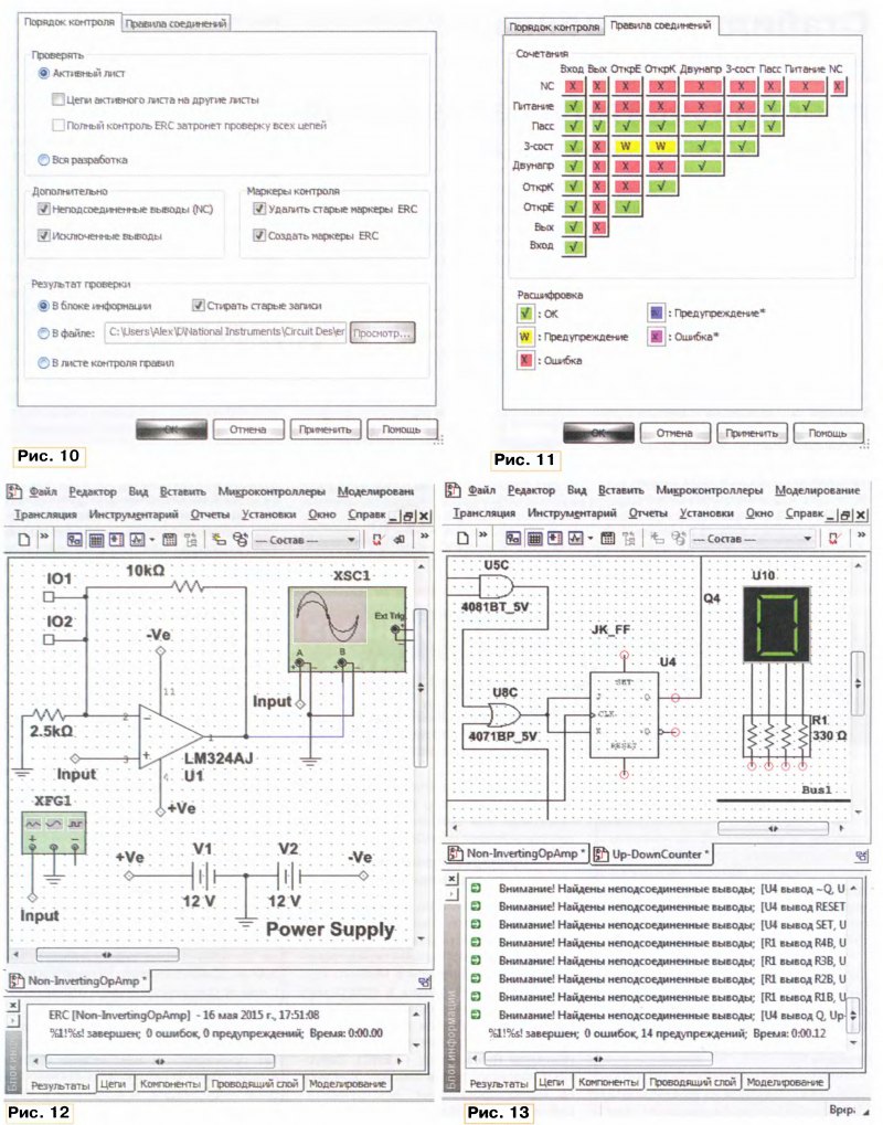 Тема: [09-2015] Проектирование электронных среде N1 Design Tool. Часть 2Проектирование электронных среде N1 Design Tool. Часть 2 Т. Колесникова, г. Хмельницкий, Украина огда устройство "собрано" в рабочем окне программы Multisim 12.0 и к нему "подключены" все необходимые приборы, анализ его работы начинают с помощью экранной кнопки "Выключатель моделирования", которая находится в правом верхнем углу окна программы или же с помощью экранной кнопки "Пуск" на панели инструментов "Моделирование”. Ту же функцию выполняет и клавиша F5. Чтобы временно приостановить процесс моделирования, используйте экранную кнопку "Пауза", находящуюся в правом верхнем углу окна программы, а также экранную кнопку "Пауза" панели инструментов "Моделирование" или клавишу F6. Остановить моделирование можно повторным нажатием на экранную кнопку "Выключатель моделирования" или с помощью экранной кнопки "Стоп" на панели инструментов "Моделирование". Результаты моделирования можно вывести на принтер или передать в текстовый или графический редактор для дальнейшей обработки. Проверка правильности соединений При соединении на экране компьютера компонентов электрических схем сложных устройств между собой не исключены ошибки. Поэтому перед трансляцией подготовленной в Multisim 12.0 принципиальной схемы в программу Ultiboard 12.0 для разработки печатной платы рекомендуется проверить правильность электрических соединений (Electrical Rules Check — ERC). Запускают проверку, подав команду основного меню программы "Инструментарий—Проверка правил соединений". Отчёт о результатах проверки будет выведен на панель "Блок информации" на вкладке "Результаты", которая находится в нижней части окна программы. Для быстрого поиска места выявленной ошибки на схеме щёлкните дважды левой кнопкой мыши по строке с описанием ошибки на вкладке "Результаты". На схеме это место будет подсвечено. Режимы и правила проверки задают в окне "Контроль электрических соединений", которое открывают командой "Инструментарий->Проверка правил соединений". Это окно содержит две вкладки. Рассмотрим вкладку "Порядок контроля" (рис. 10) более подробно. В её верхней части находится поле "Проверять", в котором можно задать проверку только активного листа схемы либо всей схемы целиком. Поле "Маркеры контроля" предоставляет возможность путём установки флажков задать необходимость создания на схеме маркеров ERC, отмечающих ошибки, а также удалить старые маркеры ERC. В поле "Дополнительно" аналогичным образом указывают, считать ли ошибками ни с чем не соединённые либо отсутствующие на схеме выводы компонентов. В нижней части вкладки "Порядок контроля" расположено поле "Результат проверки". В нём можно задать вывод отчёта о результатах проверки в блок информации, в файл или в лист контроля правил и удаление результатов предыдущих проверок ("Стирать старые записи"). На вкладке "Правила соединений" (рис. 11) задают уровень серьёзности выявляемых ошибок: предупреждение, ошибка, игнорировать. ![]() Запускают процедуру проверки схемы с помощью экранной кнопки ОК в окне "Контроль электрических соединений". На рис. 12 представлены схема, в которой проверка ошибок не выявила, и отчёт о результатах этой проверки на вкладке "Результаты" панели "Блок информации". Рис. 13 демонстрирует схему, в которой ошибки имеются (их места помечены цветными маркерами), вместе с отчёт
