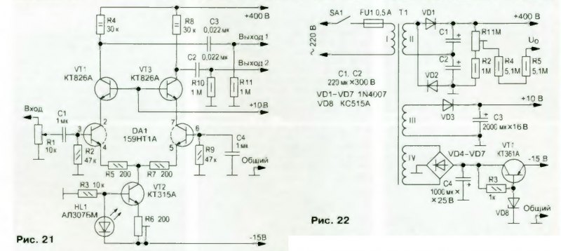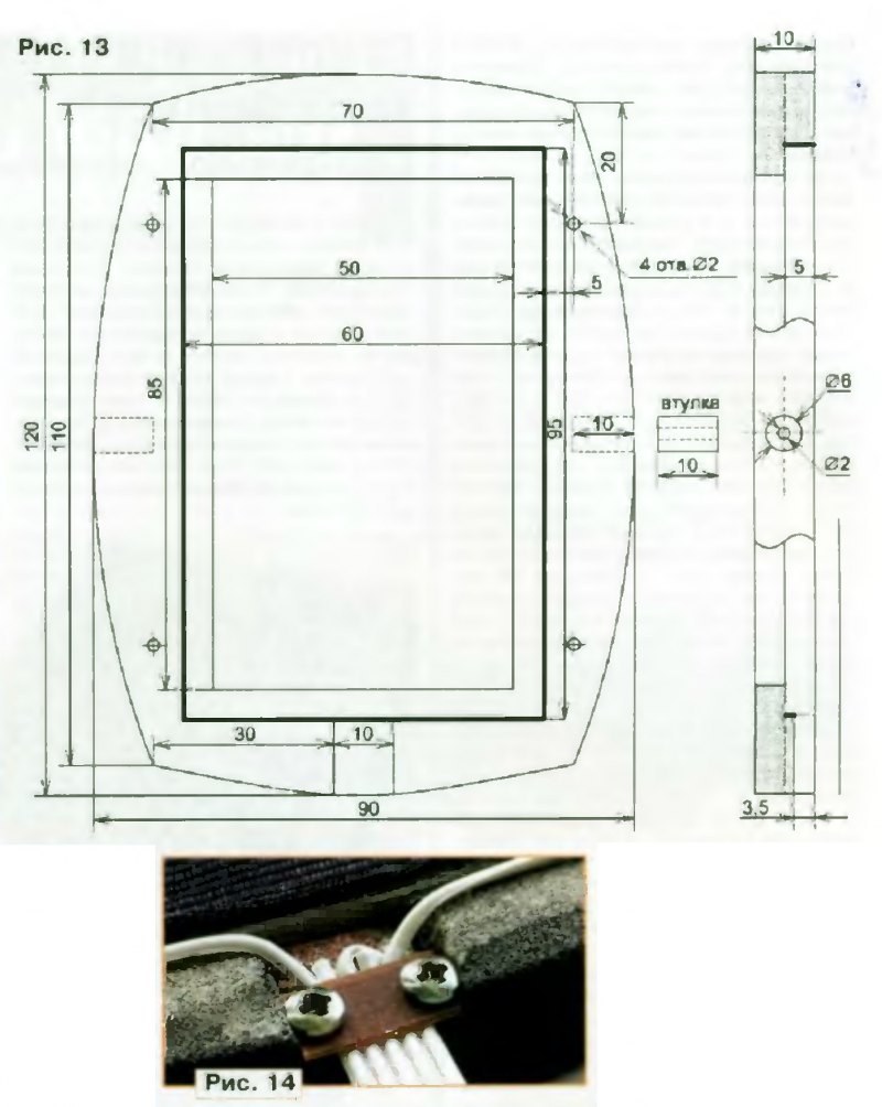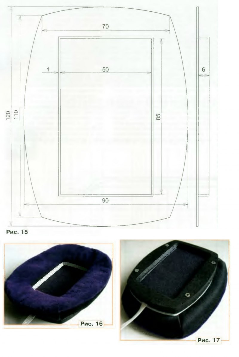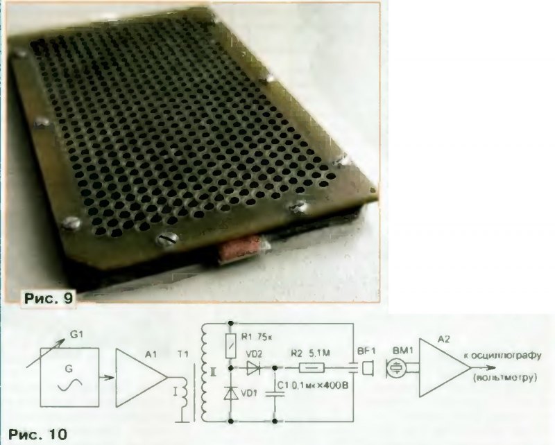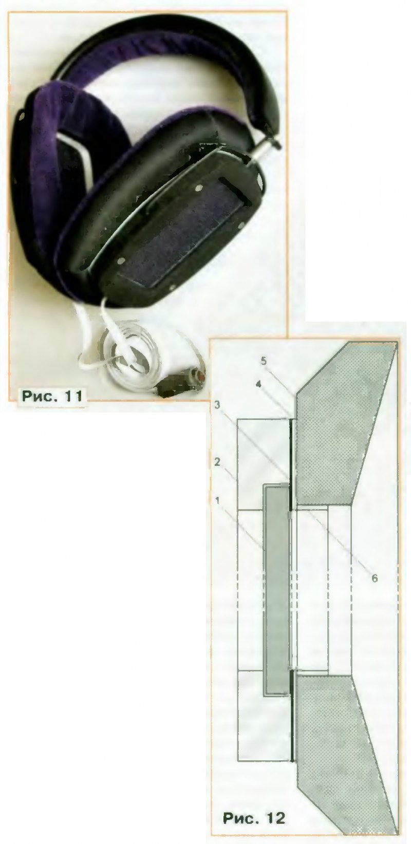 Тема: [10-2015] Головные электростатические телефоныГоловные электростатические телефоны В. БОНДАРЕНКО, г. Братск Иркутской обл Пакет с мембраной готов (рис 9), и теперь можно оценить частоту резонанса мембраны точнее Ситуация упрощается если уже есть готовый усилитель для электростатических ГТ. В дополнение к нему понадобится (вне ратор звуковых частот и микрофон. В противном случае можно воспользоваться обычным УМЗЧ и трансформатором из сетевого адаптера (12 В, 1 А) включив его в качестве повышающего (Т1 на рис 10) При этом напряжение поляризации удобно получить из звуко-во1 о сигнала. ![]() УМЗЧ (А1) должен обеспечивать выходное напряжение до 10 Б на нагрузке 4 Ом. Диоды VD1, VD2 могут быть любого типа на рабочее напряжение не менее 400 В А2 — микрофонный усилитель. В качестве микрофона ЗМ1 хорошо подходит МКЭ-3 В этой связи можно воспользоваться материалом, изложенным в [5] где на базе такого микрофона представлен простой и универсальный измеритель акустического поля. Сам процесс измерения 11редельно прост. Расположив излучатель так чтобы не мешало влияние близкорасположенных предметов и изменяя частоту генератора в интервале 20...200 Гц, найти то ее значение при котором выходной сигнал микрофона максимален При этом регулировками генератора или усилителя следует установить оптимальный уровень сигнала на выходе УМЗЧ Настройку допустимо делать на слух по возросшей громкости и искажениям сигнала точность при этом вполне приемлема Как уже было сказано выше, частота резонанса должна быть в интервале 10...150 Гц. Если это не так. следует открутите винты РЭ31 разъединить винты и, воспользовавшись ацетоном, подтянуть или ослабить мембрану Для мембраны больших размеров лучше выбрать верх нее значение частоты резонанса Конечно, добиться при этом постоянства натяжения мембраны в процессе эксплуатации невозможно Оно будет меняться прежде всего, от температуры воздуха и в результате "прогрева” телефонов пои длительной работе на большой громкости Нельзя исключат.» и естественную деформацию планки При этом субъективно оценить влияние этого фактора на звучание ГТ довольно сложно На этом процесс изготовления излучателей можно считать законченным. Следует лишь к обеим их сторонам при клеить акустически прозрачную пылезащитную ткань из серии трикотажных подкладочных или эластичных синтетических материалов При этом надо иметь в виду что даже незначительное акустическое сопротивление ткани на внешней стороне излучателя приводит к изменению звучания телефонов По этой причине эту часть работы целесообразно все-таки перенести на этап настройки ГТ и уже по месту подбирать ткань. Лучшие результаты дают акустически прозрачные материалы с минимальной ворсистостью (вуаль). Повторяемость таких самодельных излучателей при условии аккуратной сборки достаточно высока — рассогласование их АЧХ в полосе частот 50.. 10000 Гц обычно не превышает 2.3 дБ. Следующим этапом является создание собственно головных телефонов т. е. конструктивного оформления для изготовленных излучателей. Иногда при этом удается использовать детали от старых, неисправных телефонов и здесь есть широкое поле для творчества Принципиальным вопросом является только выбор типа акустического оформления. В предлагаемой конструкции применено традиционное для электростатических ГТ оформлени