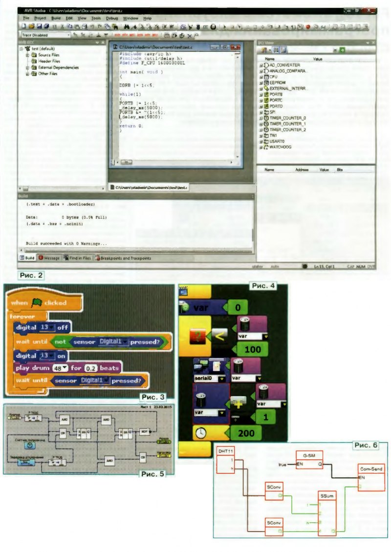 Тема: [10-2015] FLProg — система визуального программирования для ArduinoFLProg — система визуального программирования для Arduino С. ГЛУШЕНКО, г Москва Начав статью с обзора существующих средств разработки программ дне нашедших широкое применение в профессиональных и любительских разработках микроконтроллерных мол у лей Arduino, автор подробно рассказывает об одной из них — FLProg, предназначенной для пользователей, специализирующихся в электротехнике и электронике, но не владеющих языками программирования. Все предписанные программе действия изображают в этой системе наглядными и привычными для таких специалистов условными графическими обозначениями. Официальную среду разработки программ для модулей Arduino предлагают пользователям под названием Arduino IDE (рис 1) Программирование в ней происходит на языке Proces sing Wiring диалекте языка С (скорее C++) Среда представляет собой, по сути обычный текстовый редактор с возможностью трансляции текста программы в машинные коды и их загрузки в микроконтроллер модуля. Альгерна гива Arduino IDE — предназначенная для микроконтроллеоов семейства AVR ин тегриоованная среда AVR Studio (рис 2) Она служит для разработки и отладки программ на языке ассемблера, но к ней можно подкпючить и компилятор языка С. В 7006 i она сменила название на Atmei Studio. ![]() 1. Средства расширенного Форматирования обычного исходного текста разрабатываемой программы. Ее по- прежнему пишут на языке С но в более наглядном формате Сейчас таких средств очень много. Самые яркие примеры: Scratch S4A Ardublock. Они хороши для начального обучения программированию на языке С поскольку отлично показывают структуру и синтаксис этого языка. Но большие серьезные программы получаются громоздкими, на рис. 3 показан пример программы на языке Scratch. 2. Средства, скрывающие текста меняющего графическими симво за ми. В них также повторяется структура языка программирования высокого уровня формируются циклы, переходы условия. Эти средства тоже очень хороши для первоначального обучения построению алгоритмов с последующим переходом к программированию на классических языках. Но они плохо подходят для построения больших проектов ввиду громоздкости получаемых структур. Примеры таких средств — mmiBloq Algorithm Builder, Flowcode На рис. 4 показан пример программы разработанной в среде miniBloq. 3. Средства, основанные на языках FBD и LAD, применяемых в примышлен ной автоматике. Строго говоря языки npoi раммирования, как таковые в них не используются. Это скорее всего, визуальные среды для рисования принципиальных и логических схем проектируемых устройств. Примеры схем вычислительных алгоритмов, построенных с помощью сред проег гирования Horizon и FLProg, показаны соответственно ча рис. 5 и рис 0 Тем, кто привык работать с цифровой техникой больше понравится работать в этих средах, чем разрабатывать программы на классических языках программирования Подобные средства хорошо подходят как для изучения импульсной и релейной техники, так и для создания серь' зных проектов В них сконцентрирован многолетний опыт разработчиков программ для промышленных контроллероь. Но начальный уровень знаний, требующий ся для использования таких средств, значительно выше Нужно владеть основами электротехники и принципами построения электрических схем Эти средства хороши для инженеров-электриков и электронщиков киторые хотят ис
