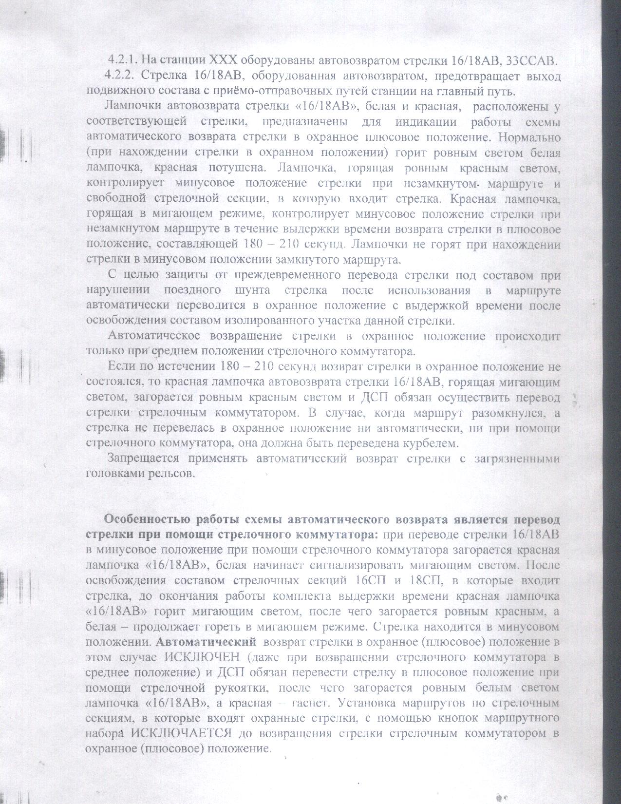 Вас нет стрелок, которые будут размыкаться 180 секунд в маневровом маршруте? Надо конкретные номера стрелок перечислить и время размыкания для них. (хотя дальше в инструкции это описано-но если только этот пункт рассматривать - то надо уточнить) Пункт 6. А разве желтую рамку не отменили? Пункт 7. Звонок не "звенит", а "звонит" ))) А так всё понятно и правильно описано. (ДНЧ-казйол!) |