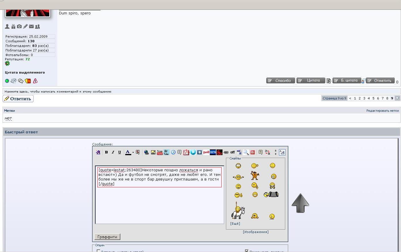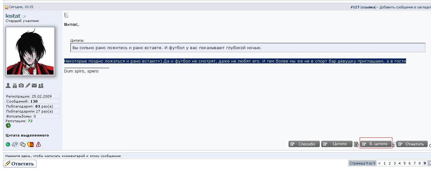1. Выделяешь нужный текст. ![]() 2. Левой кнопкой мыши щелкаешь по "Б.цитата". ![]() 3. Получаешь вот такое. ![]() 4. Отправляешь обычным порядком и получаешь вот такой вид:
