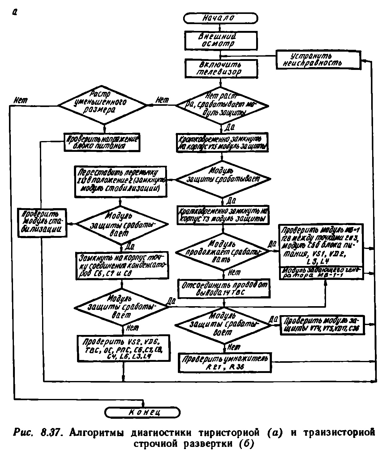 Тема: Регулировка и ремонт схем разверток телевизоров цветного изображенияРегулировка и ремонт схем разверток телевизоров цветного изображения В блоках строчной развертки телевизоров УПИМЦТ используются тиристоры (рис. 8.33). Выходной каскад выполнен на тиристорах VS 1 и VS2, которые совместно с диодами VD2 и VD6 образуют соответственно ключ прямого хода VS2, VD6 и обратного VS1, VD2. Емкости конденсаторов С9, С11, С16 и индуктивность обмоток ТВС, РЛС и СК представляют собой накопители энергии во время прямого хода развертки, а емкости С6, С7 и индуктивность L4 — во время обратного хода. Конденсатор СЗ, резисторы R6, R8, R9 и дроссель L7 предназначены для демпфирования переходных процессов при переключении тиристоров. Напряжение на выходной каскад подается через дроссель L3. Индуктивность этого дросселя совместно с емкостью конденсаторов С6, С7, С8 образует резонансную систему, обеспечивающую частичную рекурперацию энергии с выходного каскада развертки в блок питания. Конденсаторы С12, С13, С14, подключенные к первичной обмотке строчного трансформатора, позволяют регулировать длительность обратного хода и, как следствие, размер растра по горизонтали. Регулировка осуществляется перестановкой перемычки. Центровка изображения производится перестановкой соответствующей перемычки (XI9). Дроссель L13 исключает влияние схемы центровки на пилообразный ток отклоняющих катушек. Конденсатор С34 шунтирует резисторы R19, R18, определяющие пределы смещения изображения. Схема центровки питается от выпрямителей VD11, VD13 и вторичной обмотки строчного трансформатора. Пилообразный отклоняющий ток строчной развертки с выхода оконечного каскада через разделительные конденсаторы СП, С9 и регулятор линейности строк (РЛС) подается на строчные катушки ОС. Модуль защиты тиристора от замыкания в нагрузке выполнен в виде одновибратора на транзисторах VT4, VT5. Порог срабатывания одновибратора определяется стабилитроном VD17, включенным в эмиттерную цепь транзистора VT5. На базу этого транзистора с делителя напряжения R3, R7, R10 через диод VD19 поступают импульсы обратного хода строчной развертки, а с резисторов R36, R21 через фильтр R34, С39 и диод VD21 подается напряжение, пропорциональное току лучей кинескопа. Если напряжение на базе транзистора превысит допустимые пределы, одповибратор генерирует импульс длительностью 150—300 мкс. Длительность импульса определяется цепочкой R32, С37. Положительный импульс с коллектора транзистора VT4 через резистор R28 и диод VD18 поступает на управляющий электрод тиристора VS1. Так как длительность импульса одновибратора значительно превосходит длительность импульса запуска развертки, тиристор VS1 открывается на время действия импульса, значительно нагружая источник питания. Перегрузка источника питания по току приводит к срабатыванию модуля блокировки МБ-1 в блоке питания и отключению источника питания (250 В). ![]() Заданный размер изображения по горизонтали в телевизорах поддерживается модулем стабилизации. Через диод VD1 напряжение источника питания поступает на выходной каскад строчной развертки. При возврате энергии на определенной части прямого хода ток рекурперации проходит через параллельно подсоединенный тиристор VS1. Время открывания тиристора определяется положительными импульсами с выхода усилителя на тиристорах VT1 и VT2. На базу тиристора VT2 п