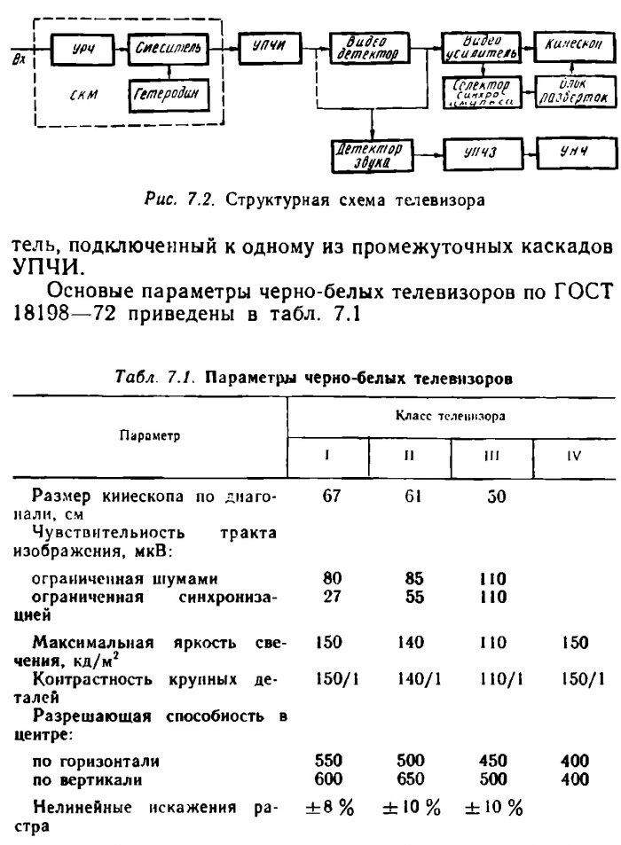 Тема: Основы телевизионной техникиОсновы телевизионной техники Телевидение основано на трех основных принципах: преобразовании энергии световых волн в электрический сигнал; разложении передаваемого избражения на элементы; инерционности человеческого зрения. Изображение любого объекта можно разбить на совокупность отдельных точек, положение которых в пространстве характеризуется тремя координатами х, у, г, яркостью В и цветом. Передача этих параметров обеспечивает получение цветного объемного изображения. Технические возможности не позволяют в настоящее время реализовать на приемной стороне объемное избражение, поэтому ограничиваются координатами плоскости (х, у), цветом и яркостью. Черно-белое телевидение передает только текущие значения координат х, у и яркость элементов картинки. В телевизионном вещании принята линейно-строчная развертка с постоянной скоростью и направлением передачи элементов изображения и неизменной скоростью чередования строк и полей. На передающей стороне в преобразователе свет — сигнал энергия световых волн трансформируется в электрический сигнал. В результате действия развертки на выходе преобразователя получается сигнал, мгновенные значения которого пропорциональны интенсивности освещения данного элемента изображения (видеосигнал). В него вводят с помощью устройства синхронизации импульсы, которые характеризуют уровень черного, соответствующий гашению луча в перерывах развертки между строками и полями. Сигнал с нормированным уровнем относительно уровня черного называется сигналом яркости. Обеспечение синхронности разверток на приемной стороне достигается введением импульсов синхронизации, обычно совмещенных с сигналами гашения луча. Точность синхронизации по строкам и по полю определяет точность геометрического соответствия деталей объекта и его получаемого изображения. Импульсы синхронизации передаются в одном канале с видеосигналом (сигналом яркости) и вводятся в видеосигнал с уровнем, превышающим уровень черного. Сигнал с введенными в него импульсами синхронизации и гашения образует полный телевизионный сигнал. Во всех телевизионных вещательных системах используется построчное разложение изображения. Электронный луч движется с постоянной скоростью по строкам, параллельным горизонтальным прямым линиям слева направо. Время прохождения одной строки называется временем прямого хода, а время перехода луча с конца одной строки на начало следующей — временем обратного хода. Суммарное время прямого и обратного ходов составляет период строчной развертки ТСТр. Пройдя последовательно все строки телевизионного растра, луч возвращается в исходное положение, т. е. осуществляется переход к следующему кадру. Период повторения кадров Тк определяется как сумма прямого и обратного ходов луча по кадрам. Переменная составляющая телевизионного сигнала состоит из отдельных импульсов различной длительности и формы, обусловленных размером и яркостью деталей изображения. Чем больше размер передаваемой детали, тем больше длительность импульса в видеосигнале, ей соответствующая. Другими словами, низшая частота телевизионного сигнала приблизительно равна частоте кадров. Высшая составляющая спектра телевизионного сигнала определяется минимальным размером передав