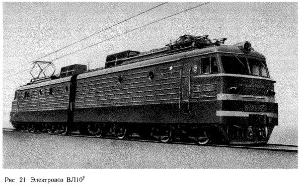 Электровозы ВЛ10У. С 1976 г. заводы ТЭВЗ (электровозы с № 101) и НЭВЗ (электровозы с № 001) начали выпускать электровозы ВЛ10 с нагрузками от оси колесной пары на рельсы не 23, а 25 тс. Эти электровозы получили обозначение ВЛ10У (рис. 21); индекс У указывает на усиление локомотива по силе тяги. Служебная масса электровоза ВЛ10У составляет 200 т. Увеличение массы достигнуто за счет размещения в каждой секции по 8 т балласта, выполненного в виде чугунных отливок, уложенных под полом коридоров. В связи с повышением нагрузки на оси в их конструкцию внесены некоторые изменения, в частности, увеличен радиус переходной галтели у подступичной части со стороны моторно-осевых подшипников с 20 до 100 мм; статический прогиб рессор тележек увеличился до 61 мм, люлечного подвешивания до 78 мм, НЭВЗ строил электровозы ВЛ10У по 1981 г. включительно, а ТЭВЗ — весь период 1976—1985 гг.