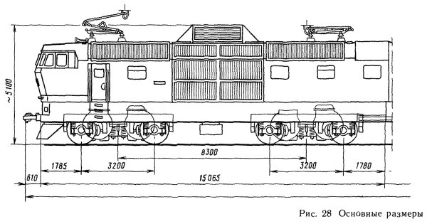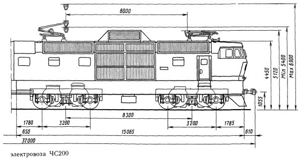 Электровоз ЧС200 (рис. 28) представляет собой двухсекционный локомотив. Каждая секция имеет кузов сварной конструкции с несущей рамой длиной 15 630 мм. Кузов опирается на две двухосные тележки с помощью люлечного подвешивания. Передача тягового и тормозного усилий от тележек к кузову осуществляется с помощью шкворней с шаровым соединением, расположенным в средних поперечных балках тележек. Секции соединены между собой жесткой сцепкой-тягой, имеющей по концам шарниры. По сравнению с опытными электровозами JVe 001 и 002 у электровозов с № 003 общая длина по осям автосцепок уменьшена на 1080 мм и составляет 32 000 мм, изменена и форма кабин машиниста.