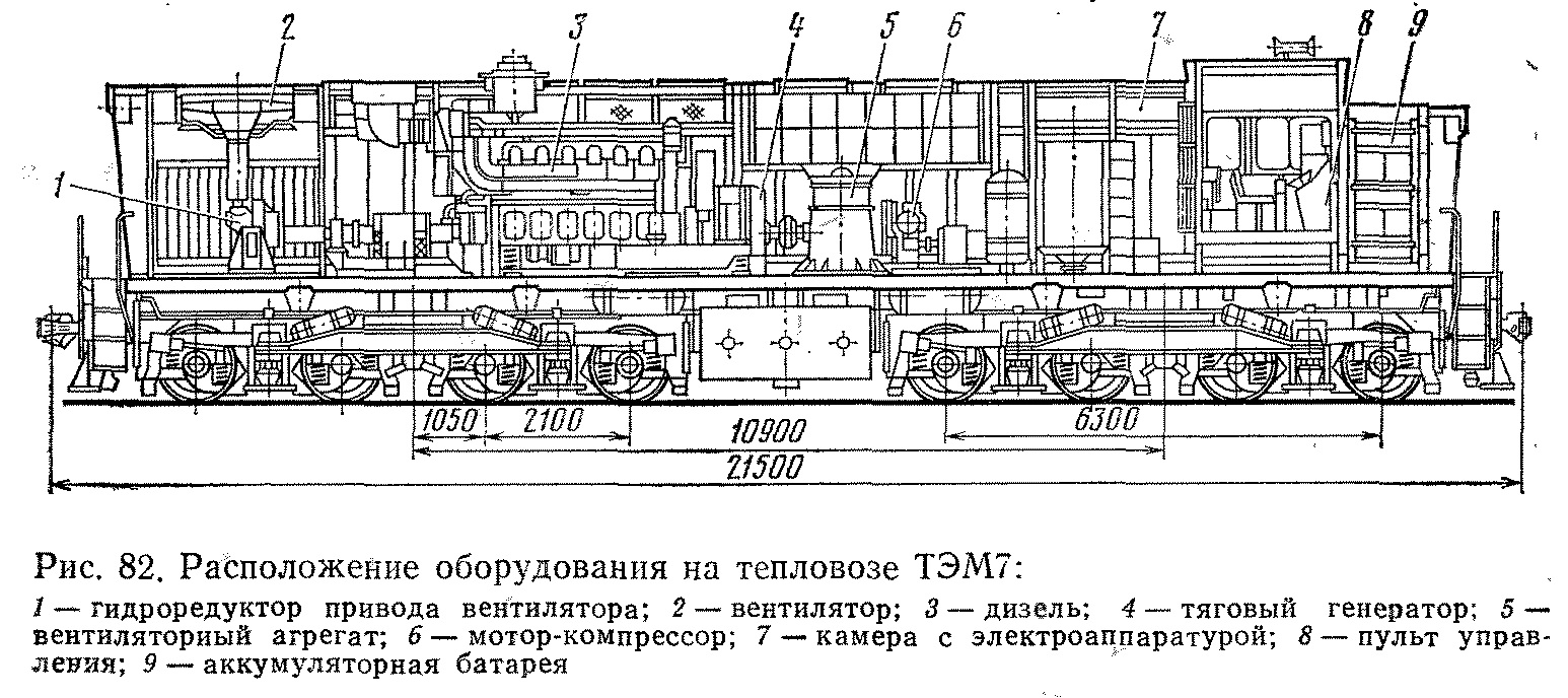 В 1973 г. на Людиновском тепловозостроительном заводе коллективом инженеров под руководством главного конструктора завода В. Н. Логунова был закончен технический проект маневрововывозного однокузовного восьмиосного тепловоза. По этому проекту в 1975 г. завод выпустил первые два тепловоза, получивших обозначение ТЭМ7 (рис. 81