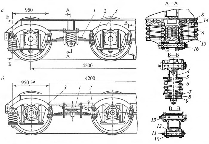 Маневровый тепловоз ТЭМ2Маневровый тепловоз ТЭМ2 (рис. 7.7), как и выпускавшийся до него ТЭМ1, предназначен для выполнения тяжёлой маневровой работы, но может использоваться и в магистральной службе. Компоновка и конструкция тепловозов ТЭМ1 и ТЭМ2 сходны, но есть и отличия. Мощность тепловоза ТЭМ1 равна 735 кВт (1000 л.с.), а ТЭМ2 — 882 кВт (1200 л.с). Увеличение мощности достигнуто охлаждением наддувочного воздуха дизеля после турбокомпрессора, т.е. увеличением весового заряда при поступлении в цилиндры. Более совершенная электрическая схема, система автоматического регулирования охлаждающих жидкостей дизеля обеспечивают тепловозу ТЭМ2 более высокие эксплуатационные показатели по сравнению с ТЭМ1. Оборудование устанавливается на главной раме, которая опирается на две трёхосные тележки 41, все оси которых ведущие. Каждая тележка через четыре опоры воспринимает вертикальные нагрузки от главной рамы. Горизонтальные усилия передаются через два центральных шкворня 33. Передняя и задняя тележки одинаковой конструкции, за исключением правой буксы средней оси задней тележки, от которой идет привод скоростемера. Кузов тепловоза капотного типа состоит из пяти основных частей: холодильной камеры, отсека над дизельным помещением, отсека над аппаратной (высоковольтной) камерой, кабины машиниста и отсека над аккумуляторным помещением. Части кузова над двигателем и аппаратной камерой съёмные для возможности выемки расположенного под ними крупного оборудования. Остальные части кузова приварены к главной раме, в них есть боковые двери и люки в крыше. Тепловая изоляция кузова над двигателем и кабины машиниста обеспечивает эксплуатацию оборудования тепловоза в условиях низких температур (до -50°С) и нормальные температурные условия в кабине машиниста как при низких, так и при высоких наружных температурах. Для вентиляции машинного помещения, аппаратной камеры и аккумуляторного помещения в дверях сделаны просечки в верхней и нижней частях, закрываемые специальными щитками при низкой температуре наружного воздуха. В дизельном помещении размещены дизель-генератор 12, компрессор 14 и другие механизмы. Дизель-генераторная установка является источником постоянного тока. ![]() Рис. 7.7. Маневровый тепловоз ТЭМ2: 1—буферный фонарь; 2—редуктор вентилятора холодильной камеры; 3—боковые жалюзи; 4—прожектор; 5—передние песочницы; б—холодильная камера; 7—жалюзи; 8—вентилятор холодильника; 9—масляные фильтры; 10 — бак для воды; И — бак для масла; 12 — дизель-генератор; 13 — турбокомпрессор; 14 — компрессор; 15—высоковольтная (аппаратная) камера; 16—звуковой сигнал; 17—двухмашинный агрегат; 18 — пульт управления; 19 — кабина машиниста; 20 — аккумуляторное помещение; 21 — антенна; 22 — задние песочницы; 23—приёмопередатчик; 24—аккумуляторная батарея; 25—преобразователь; 26—блок питания радиостанции; 27—автосцепка; 28—тяговый электродвигатель; 29—ручной тормоз; 30—калорифер; 31 — кран машиниста; 32 — контроллер; 33 — шкворень; 34 — вентилятор охлаждения тяговых электродвигателей задней тележки; 35 — кожух редуктора; 36—топливный бак; 37—воздухоочиститель (воздушный фильтр) дизеля; 38—топливные фильтры грубой очистки; 39—главный резервуар; 40—главная рама тепловоза; 41 — тележка; 42 — вентилятор охлаждения тяговых электродвигателей передней тележки; 43—масло- и топливоподк