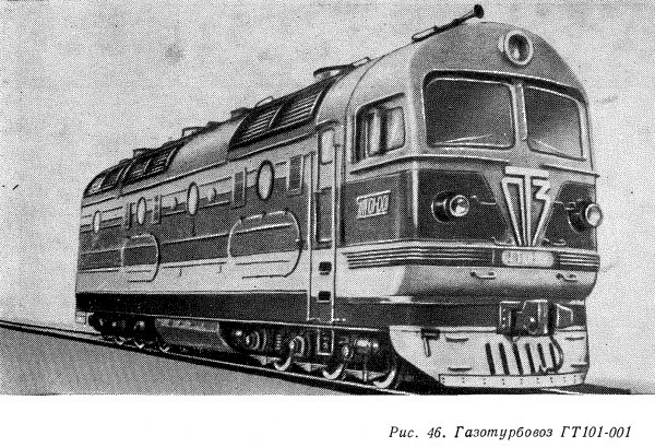 В 1960 г. Луганский тепловозостроительный завод им. Октябрьской революции построил экспериментальную секцию газотурбовоза ТГ101-001 (рис. 46). Газовую турбину для газотурбовоза изготовил Брянский машиностроительный завод. Первый рейс газотурбовоз совершил в июле 1961 г.