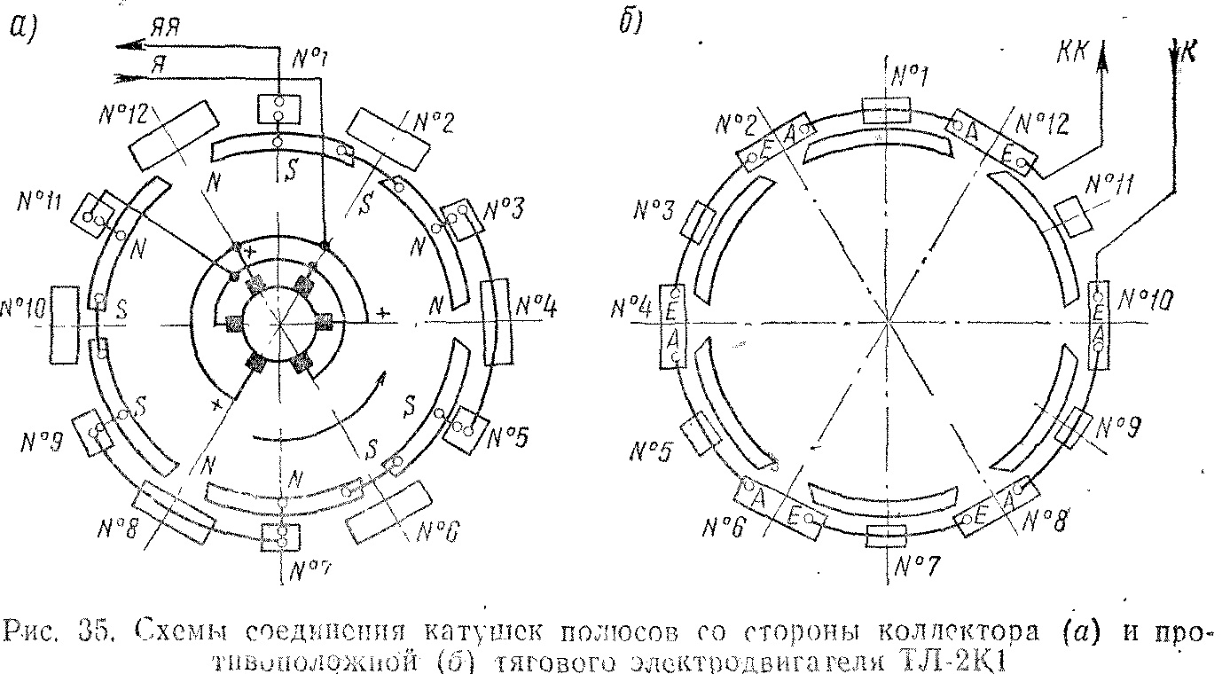 Для подвода воздуха имеется вентиляционный люк 18. Выход вентилирующего воздуха осуществлен со стороны, противоположной коллектору, через специальный кожух 5, укрепленный на подшипниковом щите и остове. Выводы из двигателя выполнены кабелем марки ПМУ-4000 площадью сечения 120 мм2. Кабели защищены брезентовыми чехлами с комбинированной пропиткой. На кабелях имеются ярлычки из полихлор виниловых трубок t обозначением Я, ЯЯ, К и КК. Выводные кабели Я и ЯЯ (рис. 35) соединены с обмотками якоря, дополнительных полюсов и с компенсационной, а выводные кабели К и КК соединены с обмотками главных полюсов.