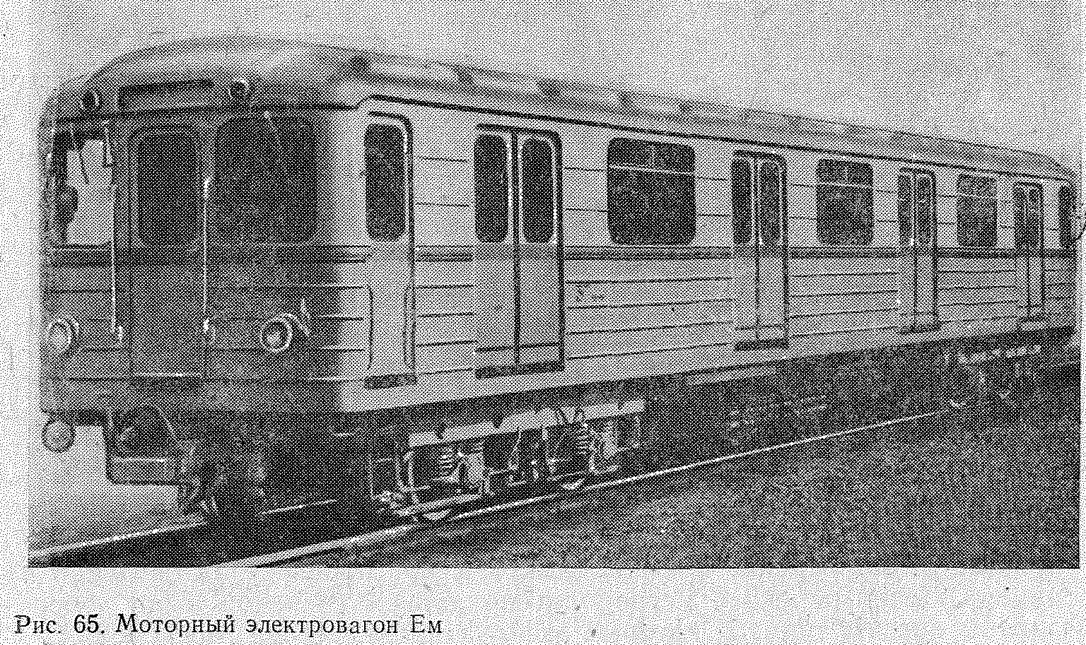 В апреле 1968 г. по чертежам Мытищинского машиностроительного завода выпустил свой первый моторный вагон Ем № 3744 Ленинградский вагоностроительный завод им. И. Е. Егорова; вагоны Ем (рис. 65) завод выпускал в период 1968—1970 гг., вагоны Ема й Емх —в период 1969—1970 гг.
